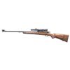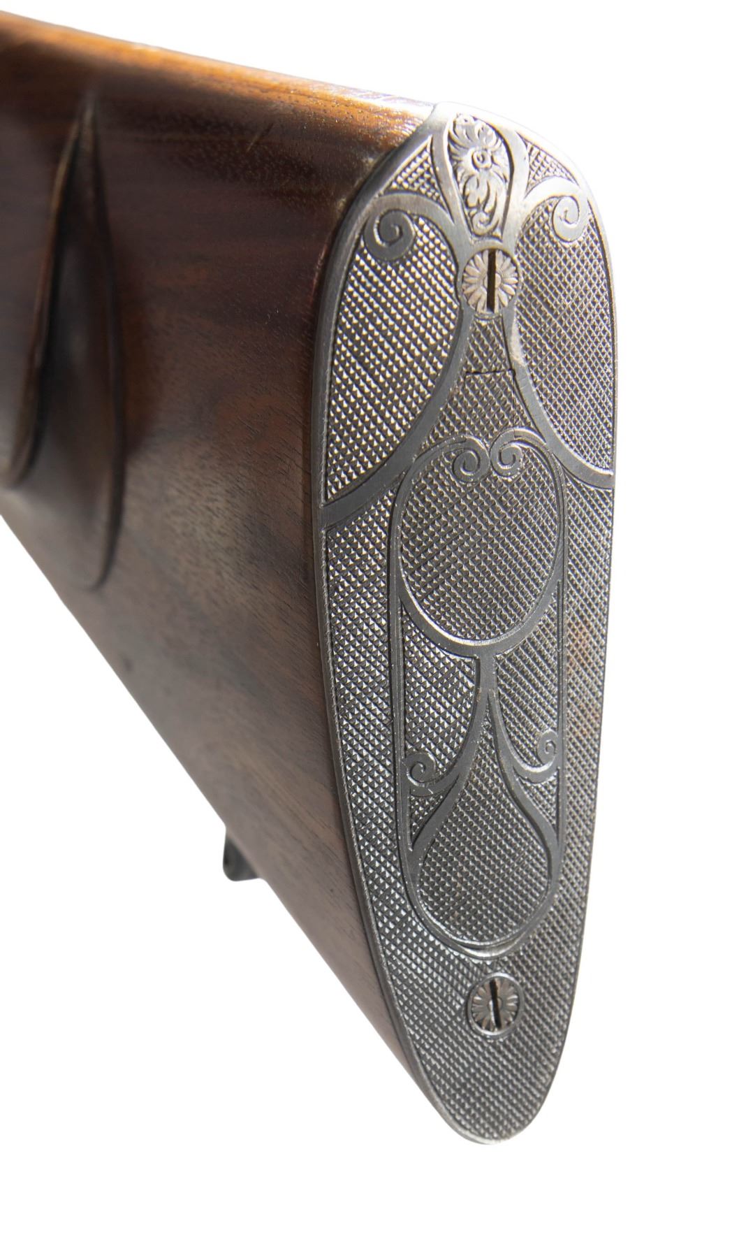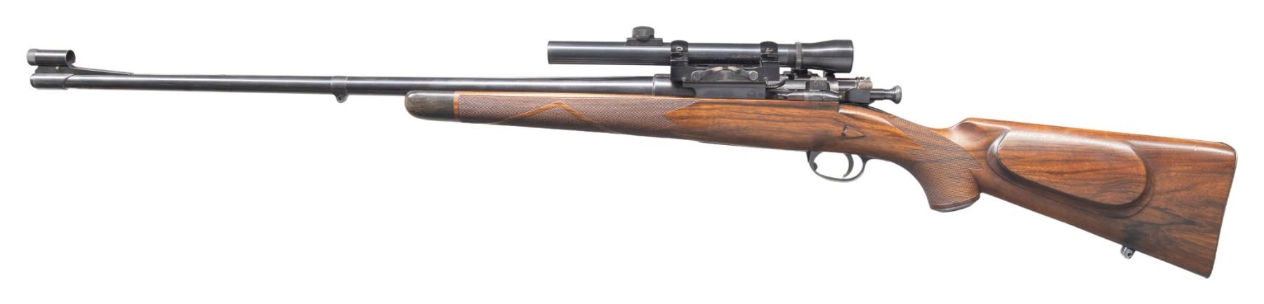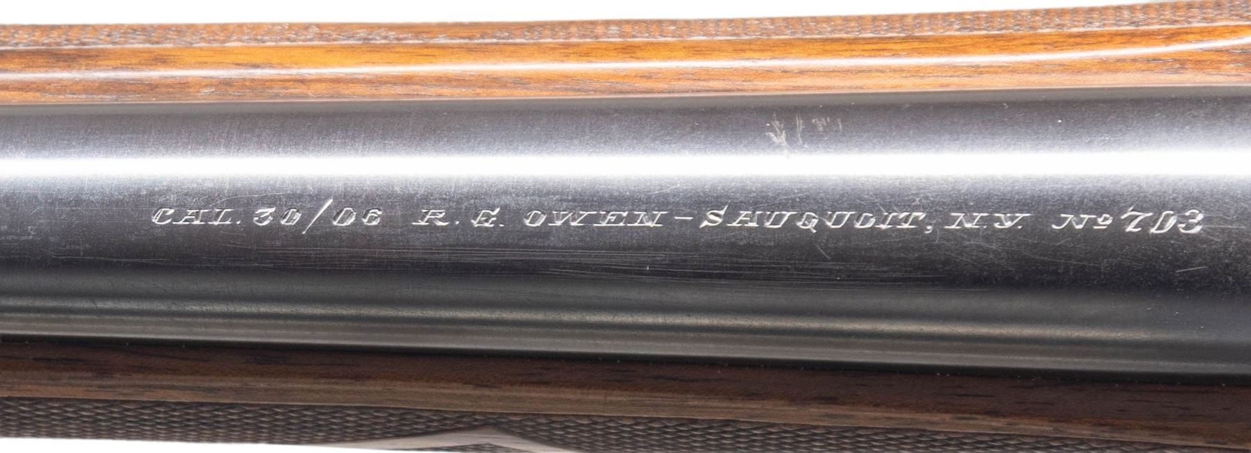 WITH SCOPE. Cal. 30-06. S# 703. The 24" reshaped military barrel is engraved "CAL. 30/06 R.G. OWEN-SAUQUOIT, N.Y. no 703" on top rear. Barrel is fitted with sleeved on front ramp with dovetailed hood holding gold bead front sight with flip-up night bead. Barrel is also fitted with sleeved on sling eye. 1903 Springfield action has been fitted with G&H side mount and Lyman 48 receiver sight (presently holding blank slide, original slide is in butt trap). Bolt has been lowered for scope use and has knob checkered and engraved. Bolt body is engine turned. Case hardened flag safety is fully checkered and silver inlaid "SAFE" and "READY". Bottom metal has had floor plate hinged with button in trigger guard bow. Bow itself is nicely contoured and slimmed. Screw heads are engraved. Steel capped pistol grip stock made of nicely veined dense European walnut measures 13-7/8" over very fancy checkered trap steel buttplate. Many uncheckered lines and scrolls run through pattern. Stock features classic Owen styling with arrowhead drop points, classically shaped beaded right hand shadow line cheekpiece, horn forend tip and toeline mounted with matching sling eye and gold shield engraved "W.W." "U.S.A.". Superb borderless checkering is of multi-point pattern at grip. Around forend, pattern is intersected with uncheckered lines. Rifle is mounted with Lyman Alaskan 2.5X scope with crosshair and post reticle in G&H alloy rings and slide. CONDITION: exceptionally fine; very close to "as new" retaining essentially all original blue on metal parts with just a hint of silvering found on edges of buttplate and grip cap. There are a few very minor marks in original fine oil finish of stock. Checkering has minimal wear. Bore is bright, sharp and shiny throughout. Mechanically fine. Scope is also very fine; optically clear. Case hardened components of scope mount are brilliant. As fine an example of the work of this highly respected American custom gunmaker as one could ever hope to find. (25-7010/MGM). CURIO. $5,000-10,000.