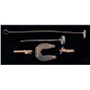 This lot contains 2 cattle brands. / 1 Large, heavy ox shoe. / 1 Barrel and frame from an early Sharps pistol. / 1 Breech from a Hall percussion carbine. CONDITION: very good for found relics; items have an iron patina. PROVENANCE: Martin Lane Historic & Western Americana Lifetime Collection. (02-21635/JS). $400-600.