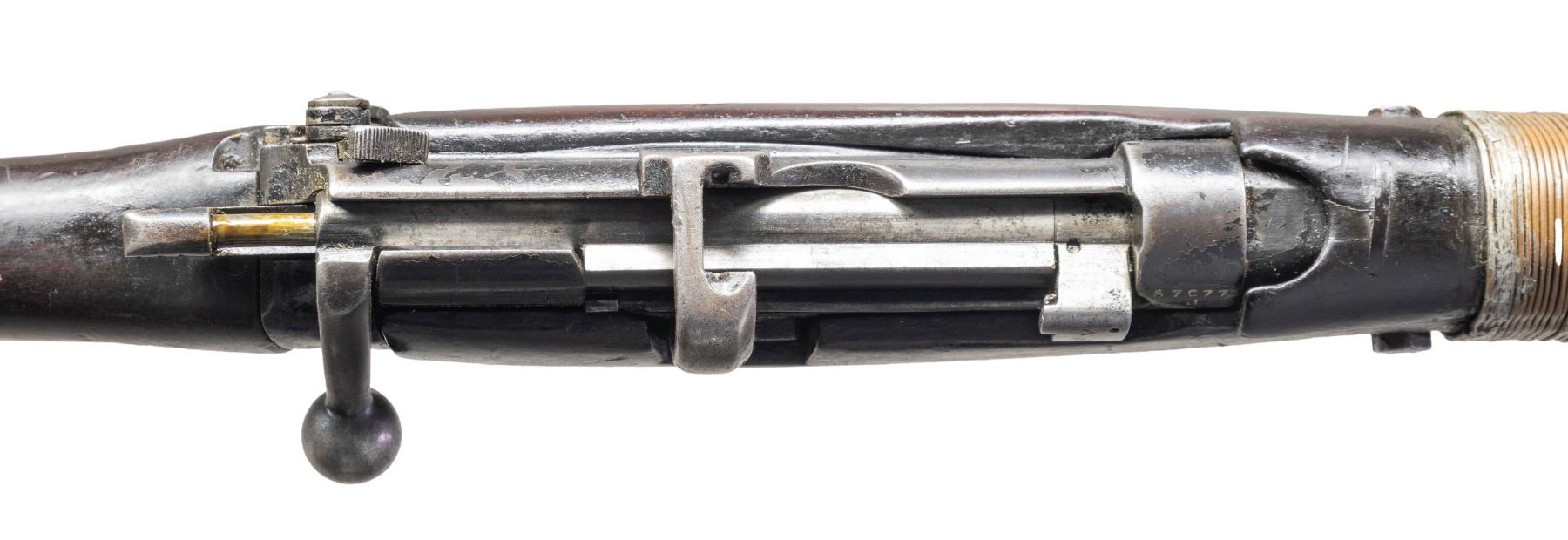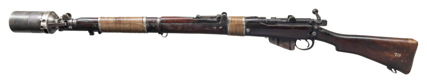 Cal. 303 Brit. S# 67077J. Bbl. 25 1/2". Standard SMLE sights. All visible matching numbers. Receiver serial has added white highlight paint. Post-war Indian Ishapore MK3 SMLE with cup grenade launcher. Socket has 1948 date with GRI Ishapore marking on right side. Left side of receiver has Springfield Sporters import marking. Suncorite finish. Hardwood stock set with reinforcement bolt & wire wrapping for grenade launching. Bottom mounted sling swivels. MAGS: 1-10 rd. matching numbered to receiver. CONDITION: stock set has a darkened appearance with a few armorer repairs, worn finish, a few gouges, scattered dings & handling marks. Metal shows overall flaking with areas turning gray & some edge wear. Action functions properly when hand cycled. Bore is bright with very good rifling & some light frosting. (25-2966/MJC). CURIO. $500-800.