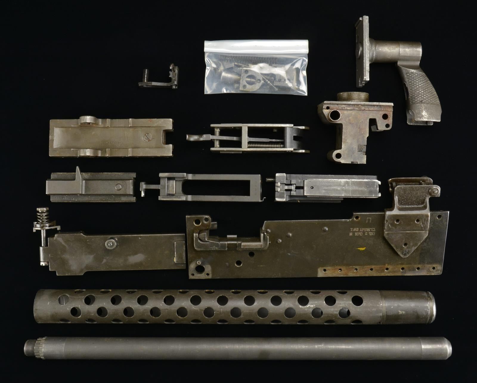 Cal. .308. Bbl. 24". Israeli model 7.62 NATO version of the time proven Browning model 1919 A4 machine gun. Parts kit appears mostly complete, missing only the right side plate & perhaps a few sm. incidentals such as rivets. Notable parts include bbl., bbl. jacket, booster, left side plate, front trunnion, rear plate / pistol grip, bolt, top cover, bottom plate, bbl. extension, trigger & accelerator mechanism, top cover latch, front & rear sights, cocking handle, etc. These parts kits are perfect for assembly by a title II manufacturer, as a functional dealer sample MG or for a civilian to make either a semi automatic variant or display model. CONDITION: these parts appear to have been assembled at one point, though it doesn’t appear that any heavy use would influence future operation. (02-14071-2/JZ). $900-1,400.