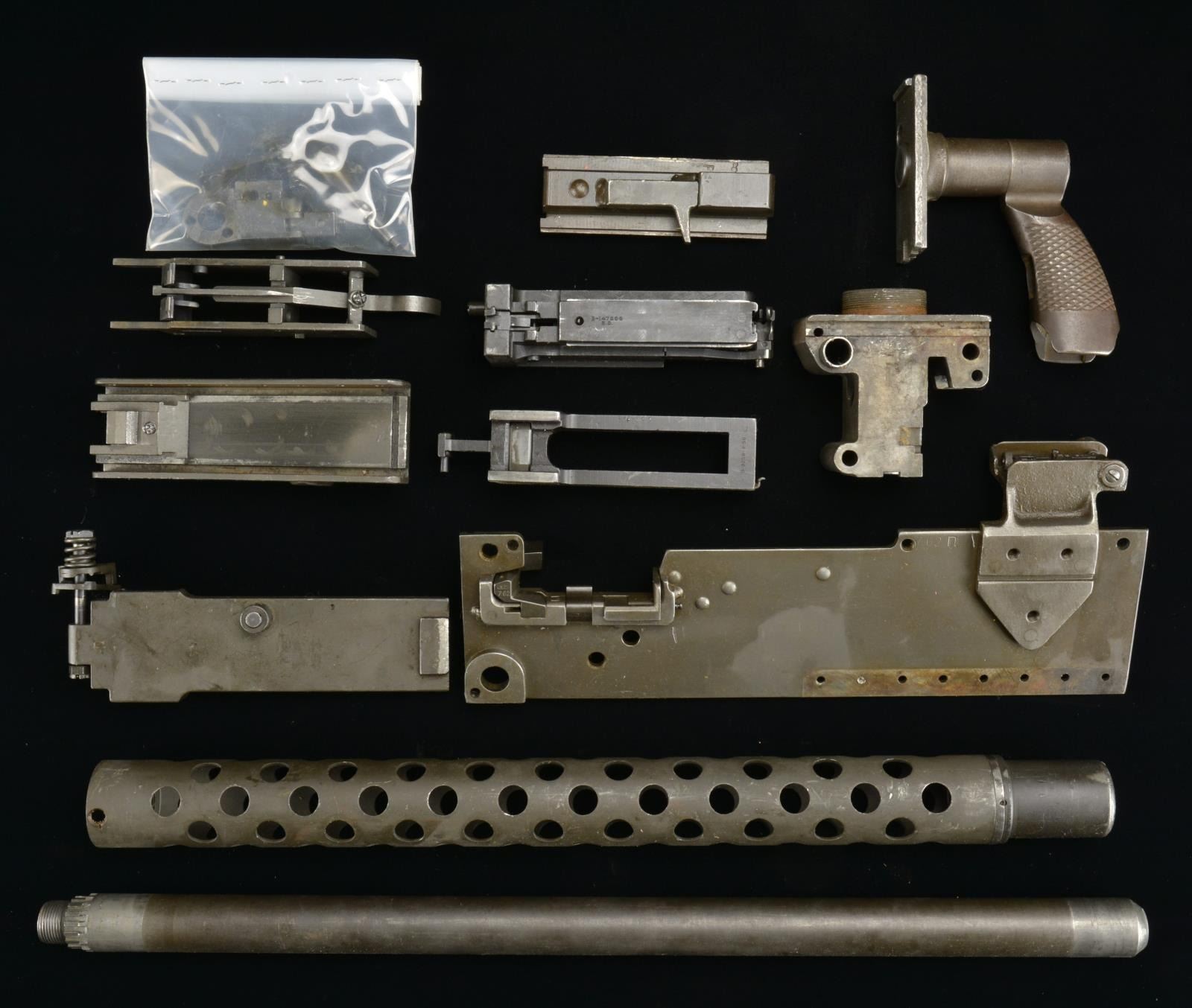 Cal. .308. Bbl. 24". Israeli model 7.62 NATO version of the time proven Browning model 1919 A4 machine gun. Parts kit appears mostly complete, missing only the right side plate & perhaps a few sm. incidentals such as rivets. Notable parts include bbl., bbl. jacket, booster, left side plate, front trunnion, rear plate / pistol grip, bolt, top cover, bottom plate, bbl. extension, trigger & accelerator mechanism, top cover latch, front & rear sights, cocking handle, etc. These parts kits are perfect for assembly by a title II manufacturer, as a functional dealer sample MG or for a civilian to make either a semi automatic variant or display model. CONDITION: these parts appear to have been assembled at one point, though it doesn’t appear that any heavy use would influence future operation. (02-14071-3/JZ). $900-1,400.