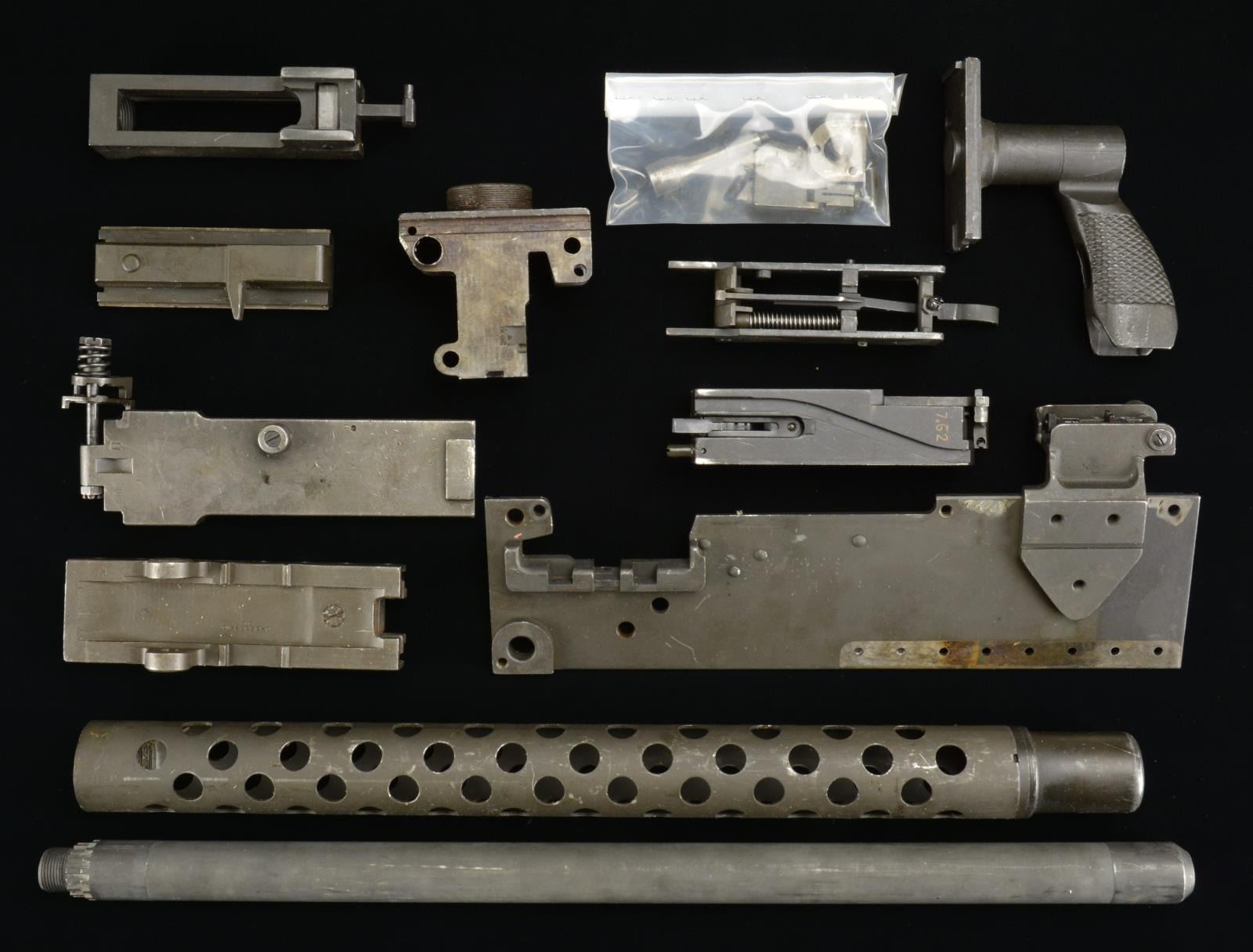 Cal. .308. Bbl. 24". Israeli model 7.62 NATO version of the time proven Browning model 1919 A4 machine gun. Parts kit appears mostly complete, missing only the right side plate & perhaps a few sm. incidentals such as rivets. Notable parts include bbl., bbl. jacket, booster, left side plate, front trunnion, rear plate / pistol grip, bolt, top cover, bottom plate, bbl. extension, trigger & accelerator mechanism, top cover latch, front & rear sights, cocking handle, etc. These parts kits are perfect for assembly by a title II manufacturer, as a functional dealer sample MG or for a civilian to make either a semi automatic variant or display model. CONDITION: these parts appear to have been assembled at one point, though it doesn’t appear that any heavy use would influence future operation. (02-14071-4/JZ). $900-1,400.