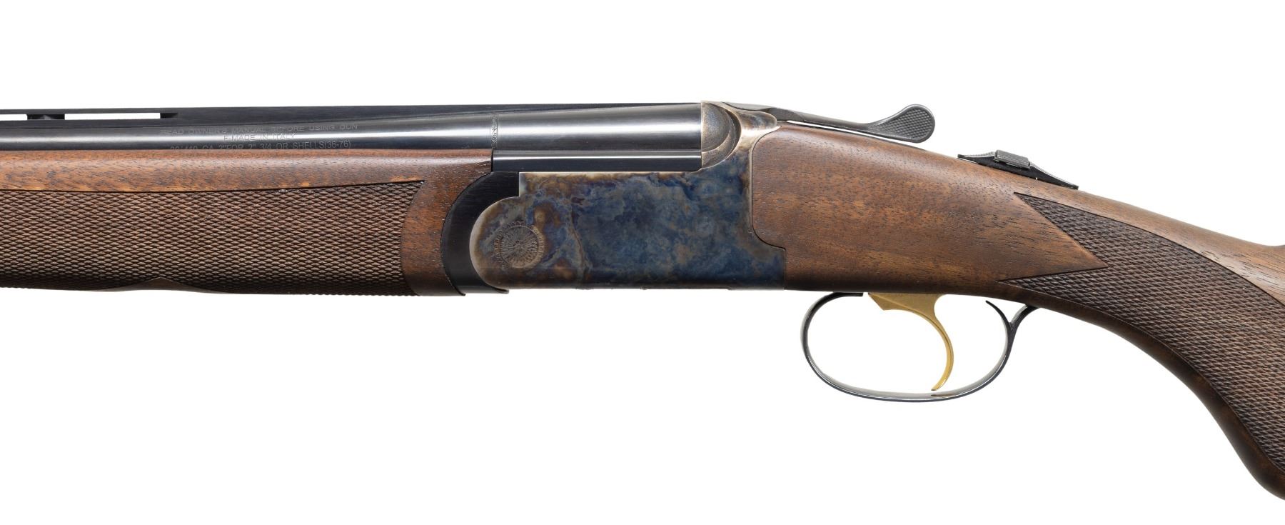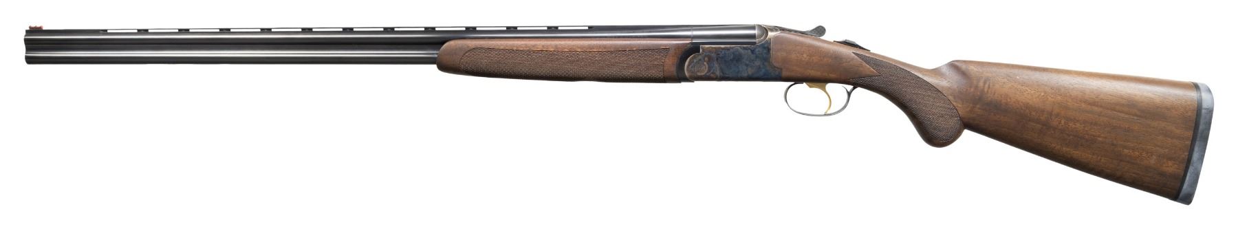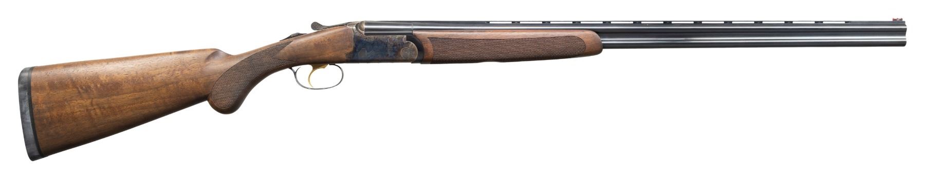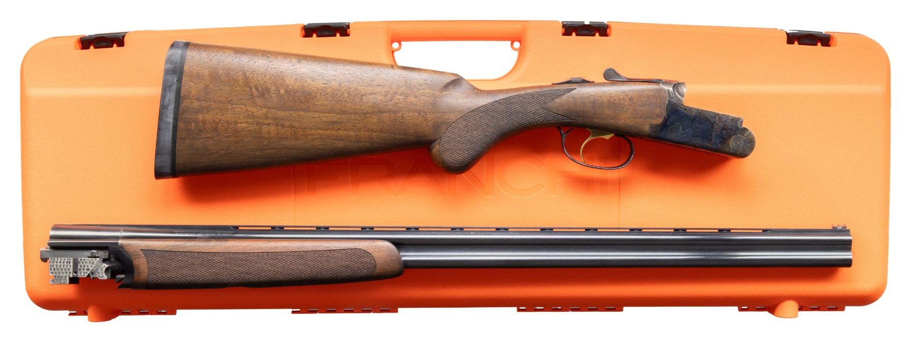 SHOTGUN WITH CASE & MATCHING BOX. Cal. 410, 2 3/4" & 3". S# FF000530. Mfg. 2013 by Franchi & imported by Benelli USA. The 28" VR barrels have fiber optic front sight. Fitted for interchangeable choke tubes; Mod, IC, and Full included. Round-bodied case hardened action with gold-plated SST, auto-ejectors, and a top tang selector. Checkered satin-finished walnut stock set; beavertail forearm and round knob pistol grip stock. LOP: 14 3/4" to buttpad. UNATTACHED ACCESSORIES: Franchi orange hard case containing paperwork, choke tube, and choke wrench. Case comes with shipping box. CONDITION: near excellent overall including bores. (24-3360/MD). MODERN. $1,000-1,500.