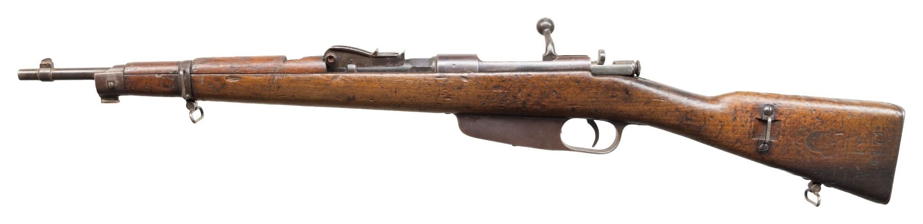 Cal. 6.5 Carc. S# IM6271. Bbl. 17 3/4". Tangent rear sight graduated to 1500m. Blade front sight. Matching numbers on stock & bbl. Interwar conversion of an 1891 long rifle to Truppe Special config. Bbl. has "MADE IN ITALY" & Terni arsenal stamps with 1900 date. Arsenal rework blue finish. Hardwood stock set with faint cartouche on left side of butt, left side & bottom mounted sling swivels. No cleaning rod present. UNATTACHED ACCESSORIES: Terni made 1891 Carcano bayonet in worn condition with scabbard that is missing one of its screws. CONDITION: stock set has arsenal rework type finish with several added slash marks on underside of wrist, an armorer type plug repair behind upper tang, a few gouges, scattered dings, handling marks & scratches. Metal is mostly a gray color with some denting on bottom of mag well, traces of arsenal rework blue, scattered edge wear, oxidation, dings & handling marks. Action functions properly when hand cycled. Bore shows scattered oxidation & pitting but evident rifling. (25-5605/MJC). CURIO. $100-200.