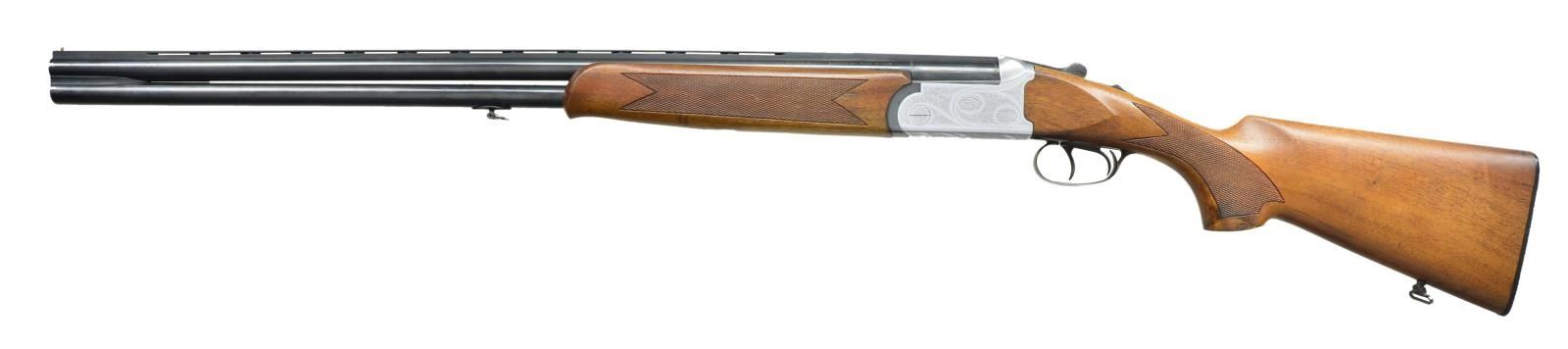 Cal. 20 Ga., 3". S# 197857 (AZ = 1990). The import marked 28" VR bbls. has brass bead & sling swivel. Full over Mod chokes. Coin finished action w/ scroll engraving, floral rose bouquets & geometric patterns. Blue trigger guard has right side rolled edge. Action features dbl. triggers, extractors & non automatic safety. Checkered walnut schnabel tipped forearm & pistol grip stock w/ sling swivel. LOP: 14 3/4" & 13 3/4" to Antonio Zoli buttplate. DAC: 1 1/2". DAH: 2 1/2". WEIGHT: 6 lbs., 10 oz. UNATTACHED ACCESSORIES: black plastic case containing Waffenpass. CONDITION: very good blue w/ occasional spot of peppery oxidation. Very good coin finish. Very good wood finish w/ light handling marks throughout & notable dents & gouges around buttplate. Action appears tight. Very good shiny bore. PROVENANCE: "Save the Fine Guns". T&G German Gun Imports, bringing fine German guns to a more appreciative market. (22-6440/MD). MODERN. $400-600.