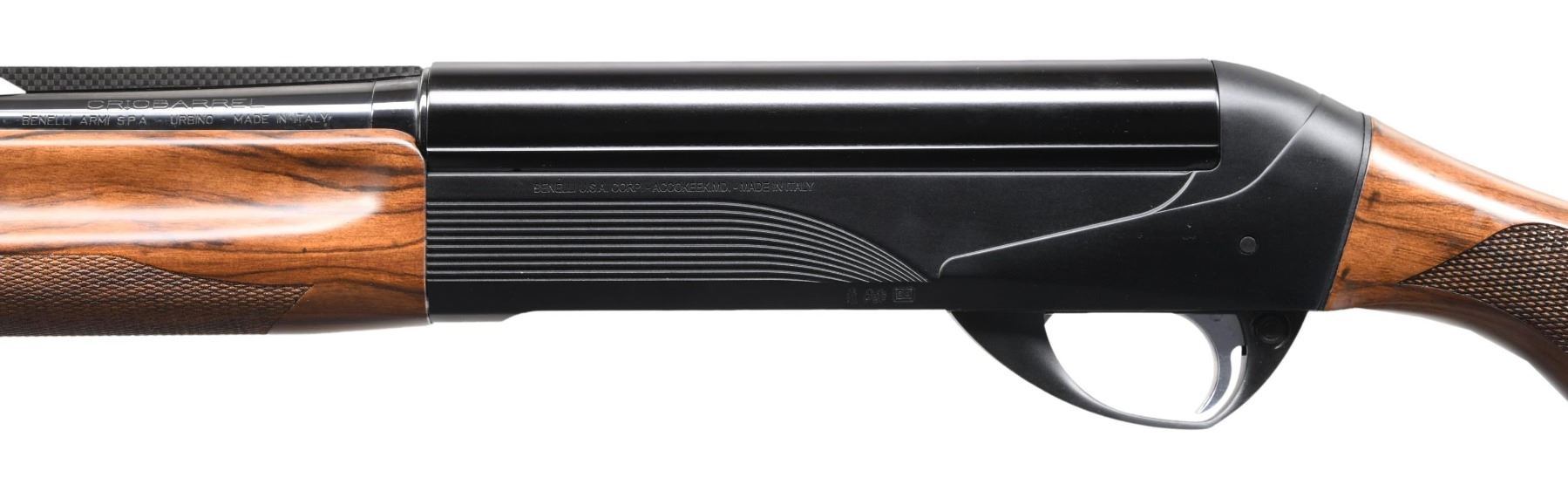 SEMI AUTO SHOTGUN WITH MATCHING BOX & CASE. Cal. 28 Ga., 2 3/4". S# XA07266N (CH = 2011). The 26" VR Criobarrel has red fiber optic front sight. Fitted for interchangeable choke tubes; Full, Mod & IC included. Featherlight alloy action with 2 shot mag. tube. Satin Walnut WeatherCoat stock with black buttpad. UNATTACHED ACCESSORIES: matching numbered shipping sleeve & Benelli hard case containing paperwork, choke tubes, stock shims & oil bottle. CONDITION: all aspects near including with light residue in shiny bore. (24-3665/MD). MODERN. $800-1200.