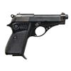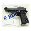 Cal. 7.65mm. S# A46394. Bbl. 3.5". Manufactured in 1968. Small, compact single action. Serrated, open slide design, w/ fixed sights. Blued finish. Serrated hammer spur. Cross slide safety, high on grips. Mag release on left side bottom of grip. 2 pc. black plastic checkered grips. MAGS: 2 factory 8 rd. UNATTACHED ACCESSORIES: Factory, folding cardboard blue & white box. Italian owners manual. Original hang tag. CONDITION: All outward aspects indicate very little use, if any. Original finish is complete & consistent w/ only gentle thinning in areas of mechanical intervention, which happens almost immediately. Original hang tag still present when received. Bright bore w/ strong rifling. (22-4856/JZ). CURIO. $350-500.