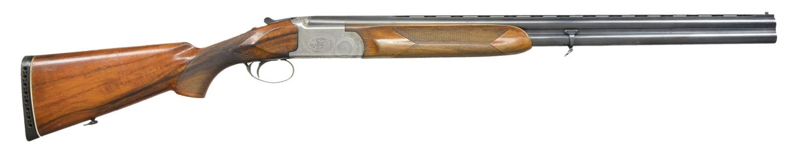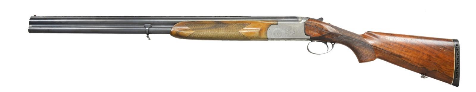 Cal. 12 Ga., 2 3/4". S# 20604 (XX = 1964). The import marked 28" bbls. w/ VR, red front sight & sling swivel. IM & IC chokes. Receiver is engraved w/ acanthus scroll, woodland pheasant scenes & geometric patterns. Action features SST & AE. Walnut target forearm & pistol grip buttstock w/ checkering & sling swivel. LOP: 14 3/8" to LAMES black ventilated pad. UNATTACHED ACCESSORIES: black plastic case. CONDITION: good lightly faded blue w/ pinprick oxidation throughout & muzzle wear. Receiver has dull patina appearance w/ nickel showing in protected areas. Fair wood finish peeling throughout w/ gouges & scratches throughout. Very good shiny bores. PROVENANCE: "Save the Fine Guns". T&G German Gun Imports, bringing fine German guns to a more appreciative market. (22-6044/MD). CURIO. $300-500.