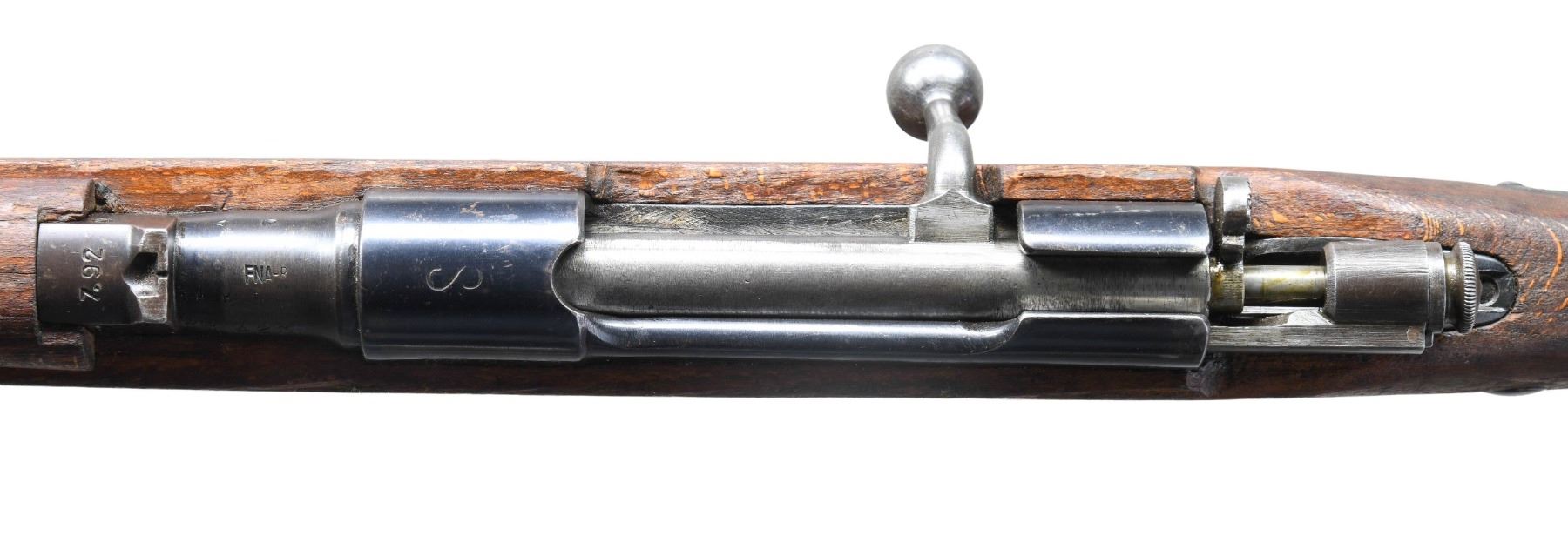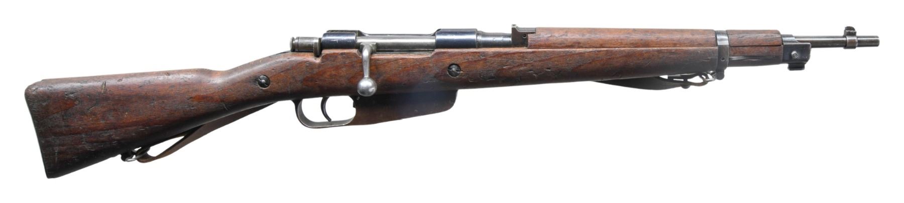 Cal. 8x57 (8mm Mauser). S# RB423. Bbl. 17 3/4" with Century import marking. Blade front sight. Fixed rear sight. Matching numbers on left side of butt & bbl. Left side of receiver has added electro pencil serial number. Post-WW2 Middle Eastern conversion of an M38 Troop Special Carcano to 8mm Mauser. Top of rear sight marked "7.92" & is missing its crossbolt. Top of bbl. has faint FNA marking. Receiver is notched & marked "S" for 8mm conversion. Arsenal blue finish. Beech stock set with bottom mounted sling swivels & leather sling. No cleaning rod present. CONDITION: stock shows a couple long cracks around recoil bolt, a couple notable handguard cracks, a couple armorer repairs, scattered gouges, dings & handling marks. Metal retains 40% arsenal rework blue with some dents on mag body, overall fading to gray, handling marks, some blued over pitting, edge wear & oxidation. Action functions properly when hand cycled. Very good bore with strong rifling. (25-2883/MJC). CURIO. $200-300.