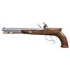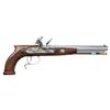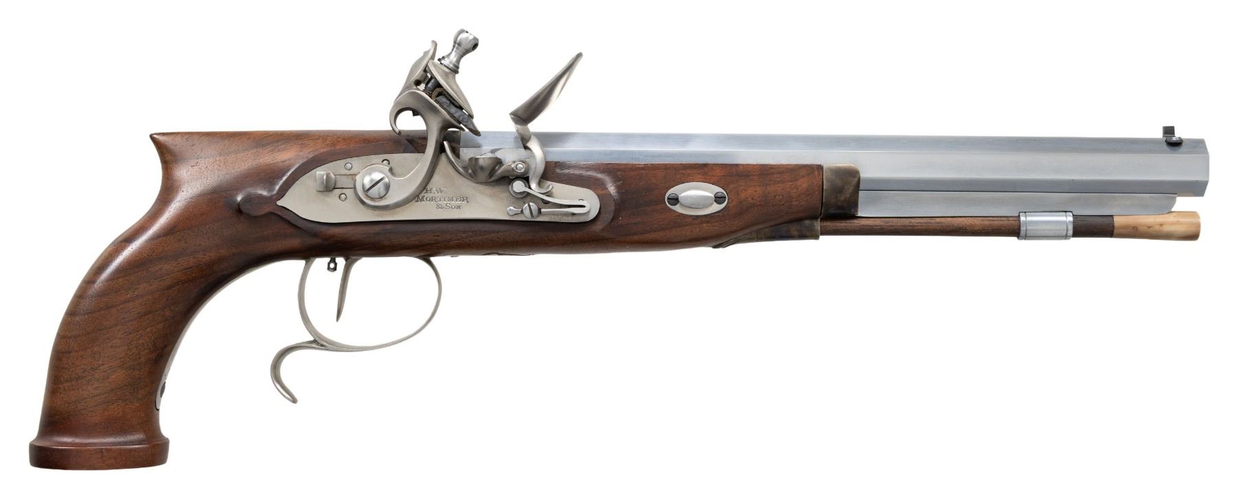 FLINTLOCK PISTOL. Cal. 44. S# PD15407. Bbl. 10 1/16". Reproduction H.W. Mortimer & Son flintlock pistol mfg. in Italy by Pedersoli in 2000. Lockplate is marked "H.W./ MORTIMER/ & SON". Top flat of the octagonal bbl. is marked "H.W. MORTIMER & SON LONDON/ GUN MAKERS TO HIS MAJESTY", with Italian proofs, the S#, the Pedersoli logo, and cal. designation marked on the left quarter flat. Lockplate, bbl., forward ramrod pipe, trigger guard, and pommel cap are polished in-the-white. Nose cap, rear ramrod pipe, and bbl. tang exhibit a case colored finish. 1-piece single wedge fastened saw grip stock, with unengraved trigger guard featuring a pineapple finial and finger curl. Top strap of stock and bbl. tang are grooved to the rear sight. Horn tipped wood ramrod. Dovetailed blade front sight with integral V-notch rear sight on tang. Set trigger. CONDITION: excellent, with metal components retaining a bright in-the-white appearance overall. Case colored parts retain the vast majority of their original finish. Proper manual mechanics, with hammer only locking in the rearmost position when set trigger is engaged. Extremely light and crisp trigger pull. Stock shows some light superficial handling marks, but otherwise remains very good to excellent overall. (01-27989/MLW). ANTIQUE. $300-500.
