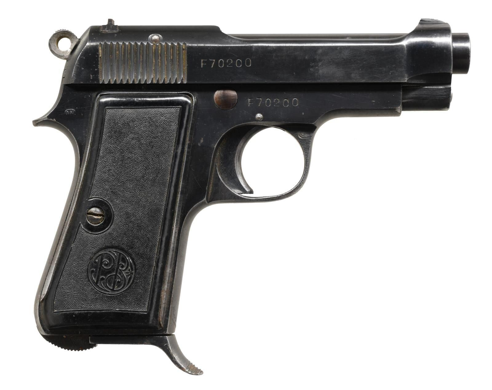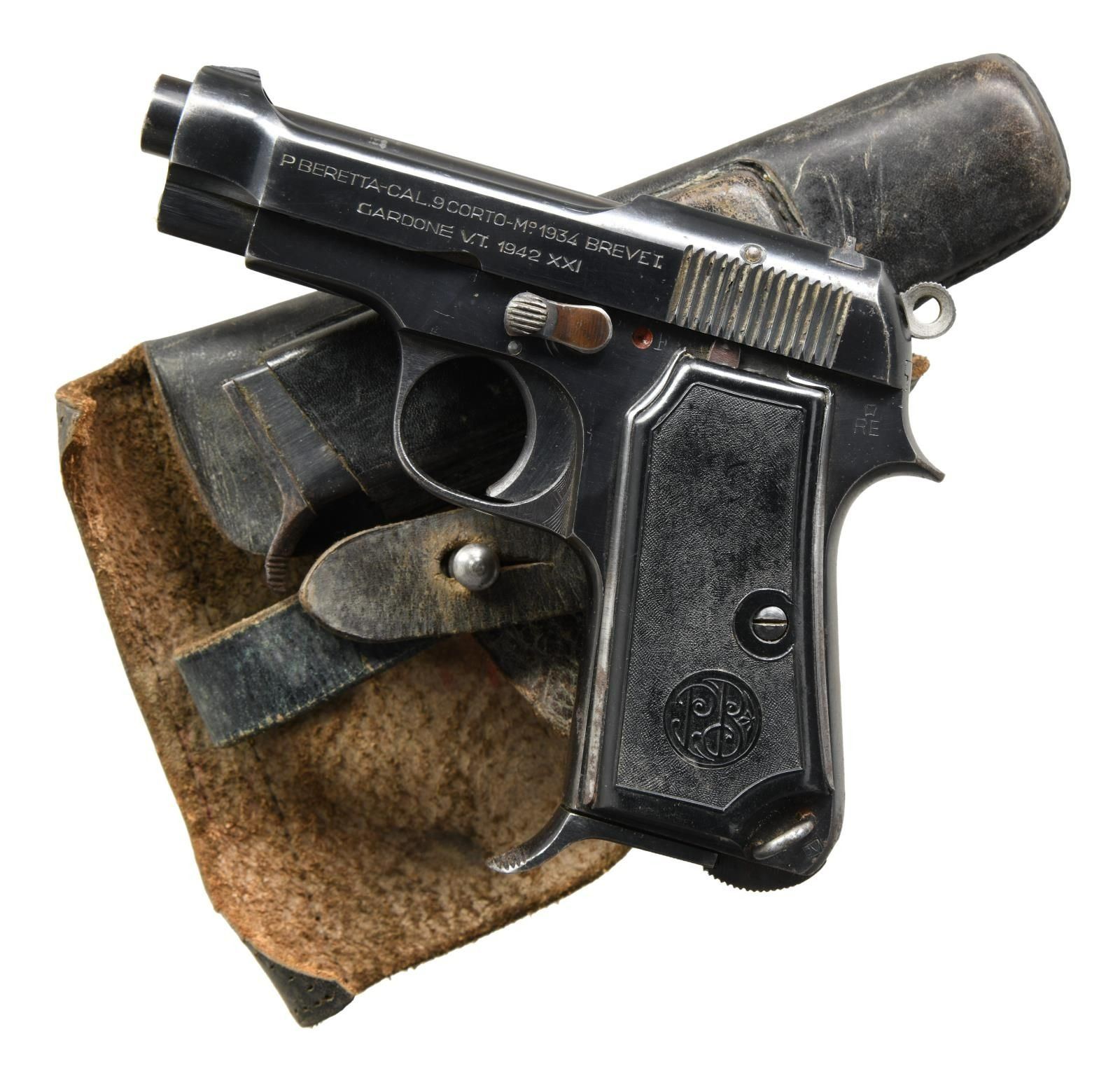 SEMI-AUTOMATIC PISTOL WITH HOSLTER. Cal. .380. S# F70200. Bbl 3 3/8". Model 1934 manufactured by Beretta in 1942. Standard markings on left side of slide, with a Crown/RE Italian Royal Army acceptance proof on the left side of the frame at the tang. Metal components are blued, with the frame being mounted with 2 piece textured Beretta "PB" monogram black plastic grips. All numbers are matching and are present on the frame, slide, and barrel. MAGS: 2 7 rnds. UNATTACHED ACCESSORIES: modified brown leather holster, with the closure strap having been cut off and belt loop having been removed. Holster contains 1 spare magazine. CONDITION: metal components retain large amounts of their original arsenal blue finish, exhibiting mild wear and some mild thinning overall, with some scattered spots of surface oxidation. Mirror bore, exhibiting light surface pitting and retaining strong rifling throughout. Grips show a few scattered marks from handling and storage, but are otherwise sturdy and serviceable. Holster remains malleable, exhibiting wear and age related cracking overall. (23-2594/MLW). CURIO. $200-400.