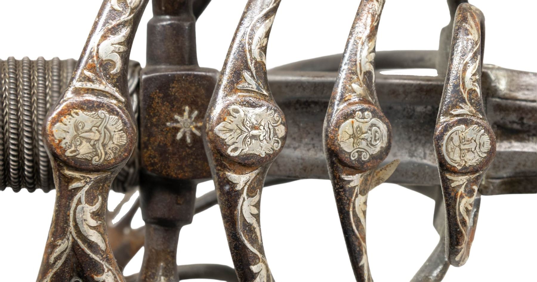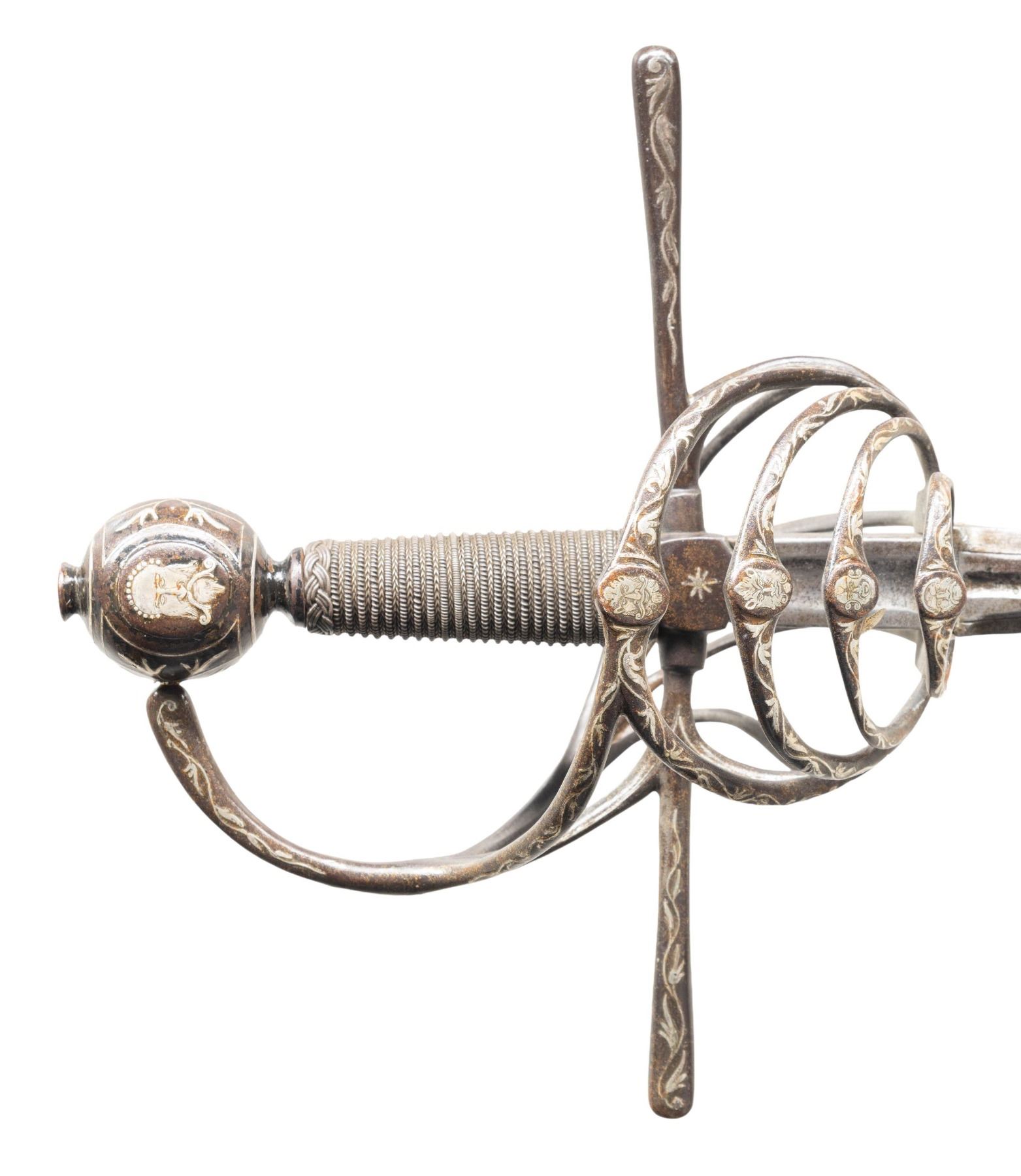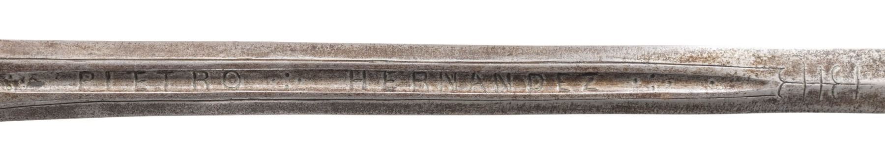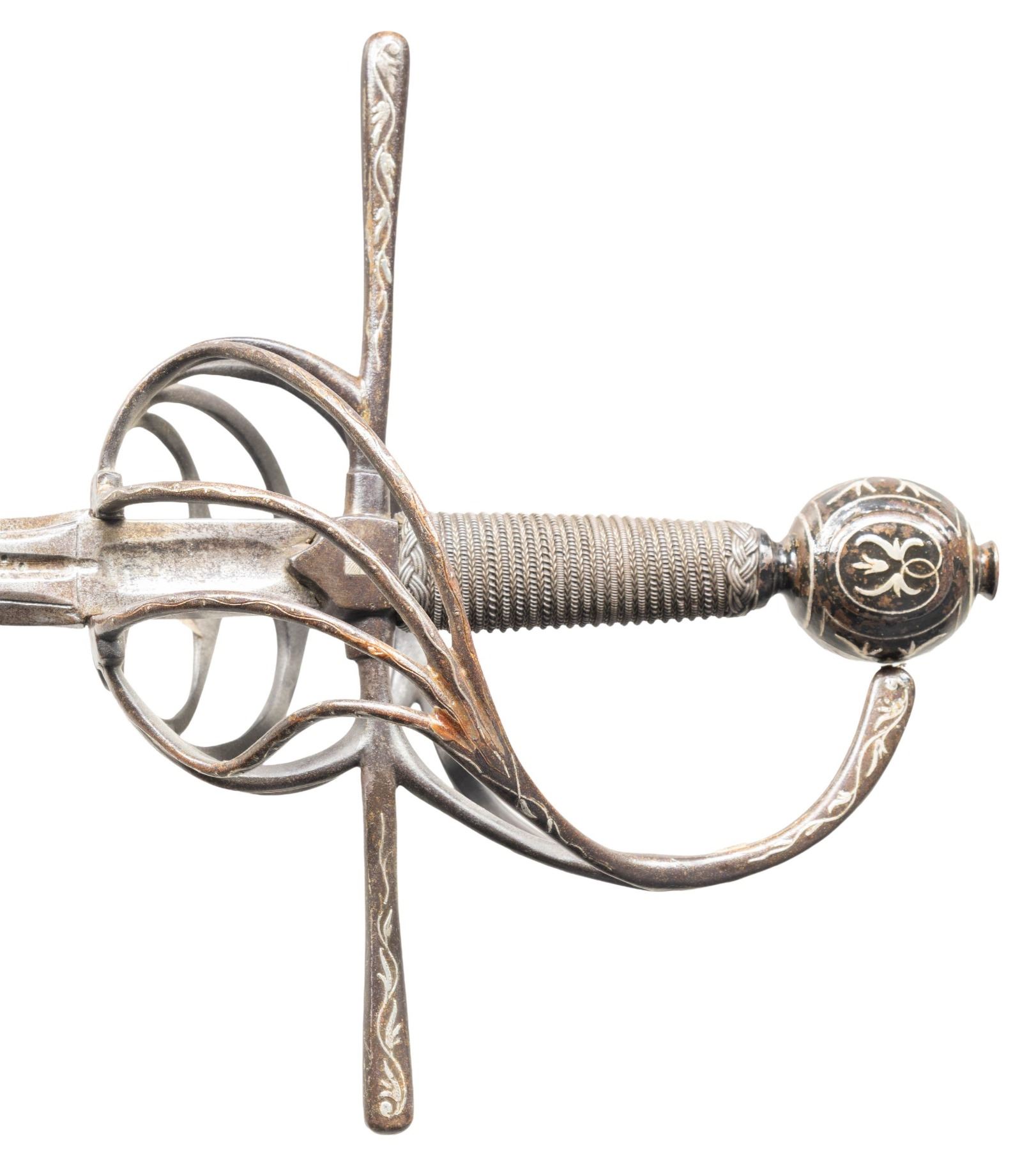 HERNANDEZ.This exquisite Italian swept hilt rapier was likely produced in the early to mid 1800s in the style of Pietro Hernandez. The rapier measures 50" overall with a signed blade measuring 42" to the base of the guard. The blade has a central 9 1/2" fuller with "PIETRO HERNANDEZ" stamped in the valley. Absolutely stunning silver inlayed iron hilt featuring a 4 branch guard adorned by 4 inlayed silver heads and numerous sections of vines. The 9 1/2" crossguard, as well as the 3 branch knuckle bow, are also inlayed with silver vines. The huge globular pommel features more vines and a large, artistically impressive, inlayed silver head of a bearded and mustached man. Iron wire wrapped grip with Turk's head knots both top and bottom. CONDITION: blade shows mottled gray patina with light wear. Hilt has a dark patina that contrasts superbly with the silver inlays. Grip shows light wear. Even though this exquisite weapon was made 200 years after Hernandez was active, is must rank as one of the finest examples of the sword smith's art. It showcases what a master is actually capable of producing. PROVENANCE: Estate Collection of Nicholas Apergis. (02-24766/BF). NON-GUN. $3,000-4,000.