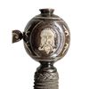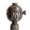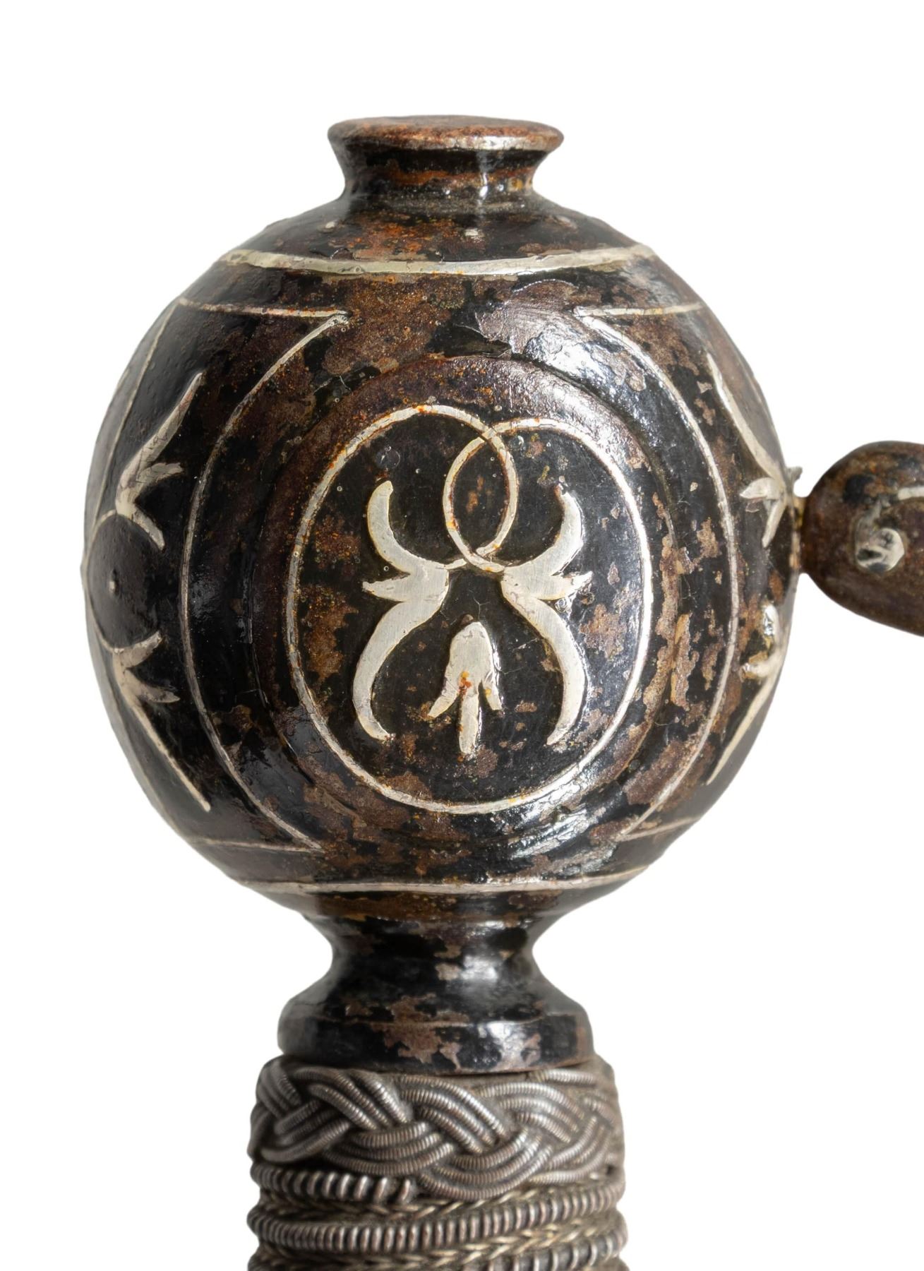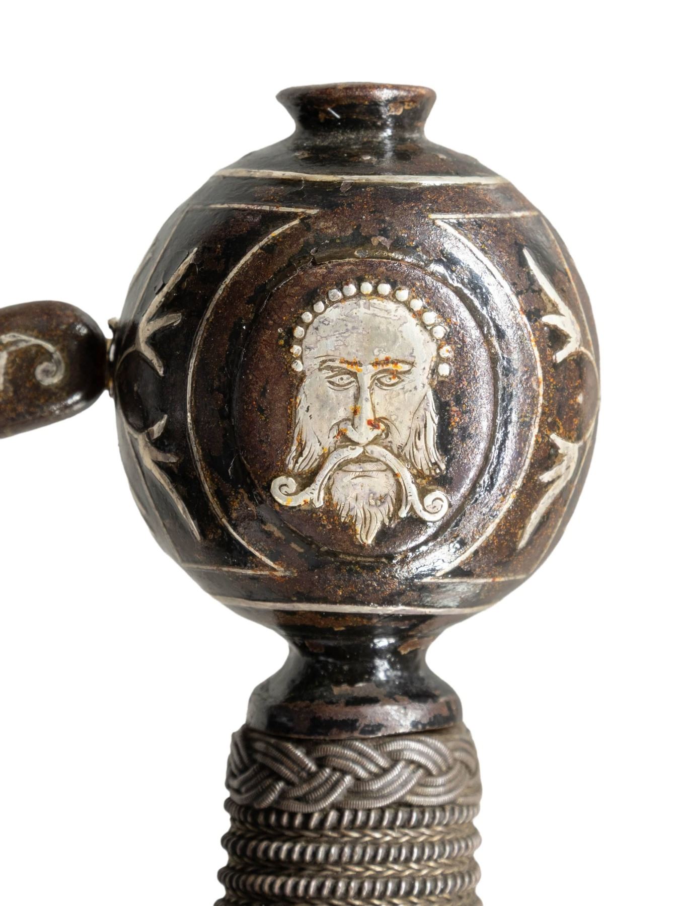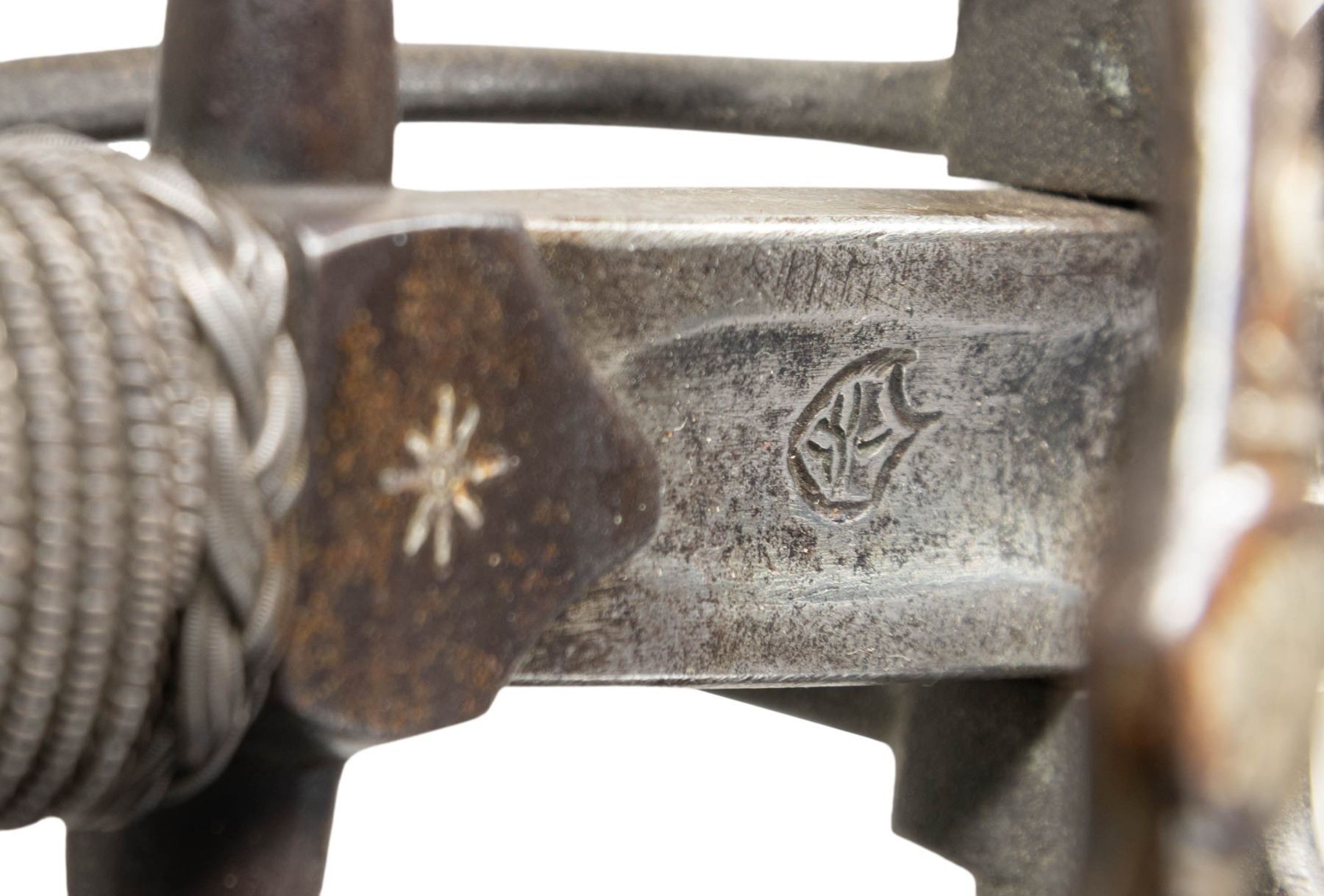 HERNANDEZ.This exquisite Italian swept hilt rapier was likely produced in the early to mid 1800s in the style of Pietro Hernandez. The rapier measures 50" overall with a signed blade measuring 42" to the base of the guard. The blade has a central 9 1/2" fuller with "PIETRO HERNANDEZ" stamped in the valley. Absolutely stunning silver inlayed iron hilt featuring a 4 branch guard adorned by 4 inlayed silver heads and numerous sections of vines. The 9 1/2" crossguard, as well as the 3 branch knuckle bow, are also inlayed with silver vines. The huge globular pommel features more vines and a large, artistically impressive, inlayed silver head of a bearded and mustached man. Iron wire wrapped grip with Turk's head knots both top and bottom. CONDITION: blade shows mottled gray patina with light wear. Hilt has a dark patina that contrasts superbly with the silver inlays. Grip shows light wear. Even though this exquisite weapon was made 200 years after Hernandez was active, is must rank as one of the finest examples of the sword smith's art. It showcases what a master is actually capable of producing. PROVENANCE: Estate Collection of Nicholas Apergis. (02-24766/BF). NON-GUN. $3,000-4,000.