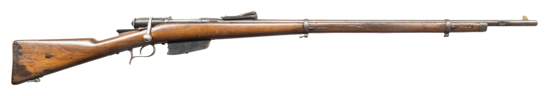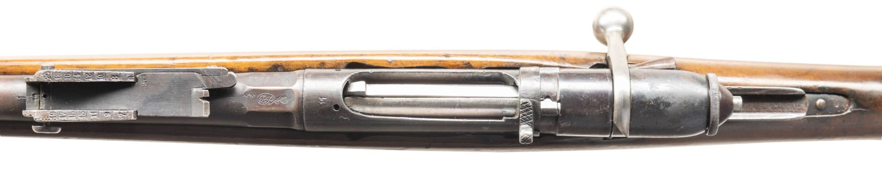 Cal. 6.5 Carc. S# VV6918. Bbl. 33 1/4". Replacement brass blade front sight. Ladder rear sight graduated to 2000m. WW1 update of an Italian Vetterli rifle to 6.5 Carcano. Matching numbers on stock & bbl. Bbl. has Torre Annuzita arsenal marking. Arsenal rework blue finish. Hardwood stock with bottom mounted sling swivels. No cleaning rod present. CONDITION: stock has added finish with notable dark staining on butt, some small cracks behind upper tang, some light chipping around butt, scattered dings & handling marks. Metal retains 50% arsenal rework blue with overall fading to gray, handling marks, ledge wear & some oxidation. Action functions properly when hand cycled. Very good bore with strong rifling. (01-28766/MJC). ANTIQUE. $200-400.