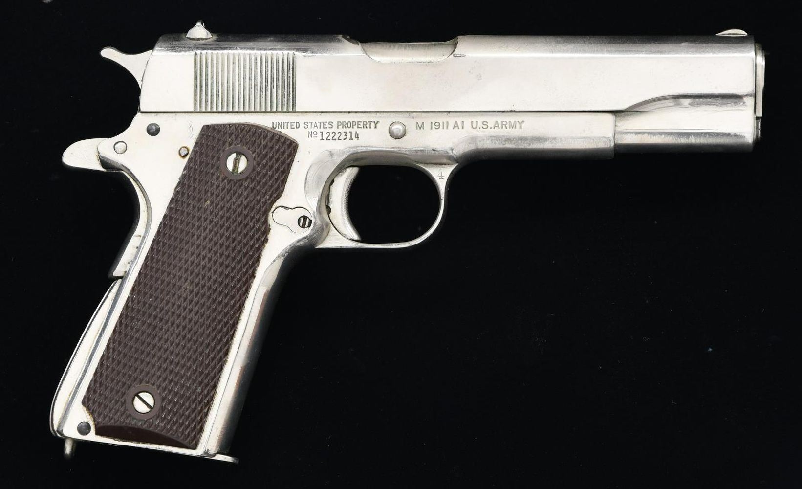 Cal. 45 ACP. S# 1222314 (originally mfg. 1943). Bbl. 5". Keyes Fiber drab brown stocks. MAGS: 1 MS Little 7 rd. renickeled mag. CONDITION: nickel is refinished, showing heavy polishing of contours, blistering of finish on top of slide, & an area of faded finish around ejection port. Very good grips. Very good bore. (23-1727/MD). CURIO. $800-1,200.