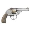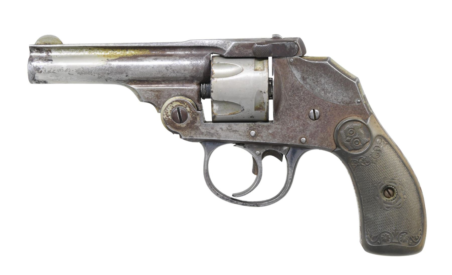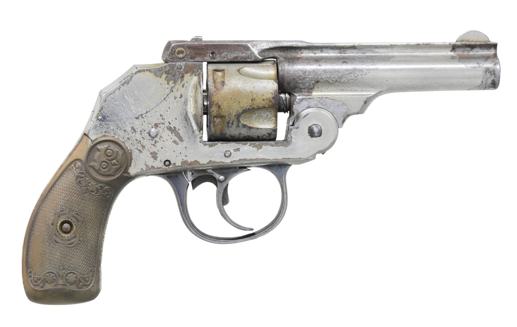 REVOLVER. Cal. 32 S&W. S# 21917. Bbl. 3". Round blade front sight. Low-profile fixed rear sight. Mfg. 1895-96. Nickel finish with a blued trigger guard; the top strap latch is loose and may require attention to fix. Checkered brown rubber grips with an owl head logo. CONDITION: The grips show heavy wear to the checkering, some dings, and staining. Metal shows overall flaking, some pitting, scattered fading to gray, and oxidation. Pitted bore with worn rifling. PROVENANCE: The collection of Gun Sport Ltd., owned by Jon R. Thomas. (01-26326/MJC). ANTIQUE. $50-75.