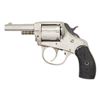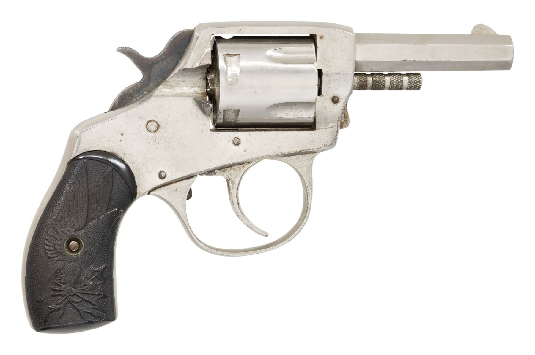 Cal. 32 S&W. S# 4033 (under left grip). Mfg. 1885-1897. Oct. 2.5" bbl. Fixed sights. Nickel finish. 5 Shot cyl. Two piece hard rubber grips with American Eagle. CONDITION: good nickel with patina & marks. Good grips. Good rifling with light pitting. (01-27859/MD). ANTIQUE. $100-150.