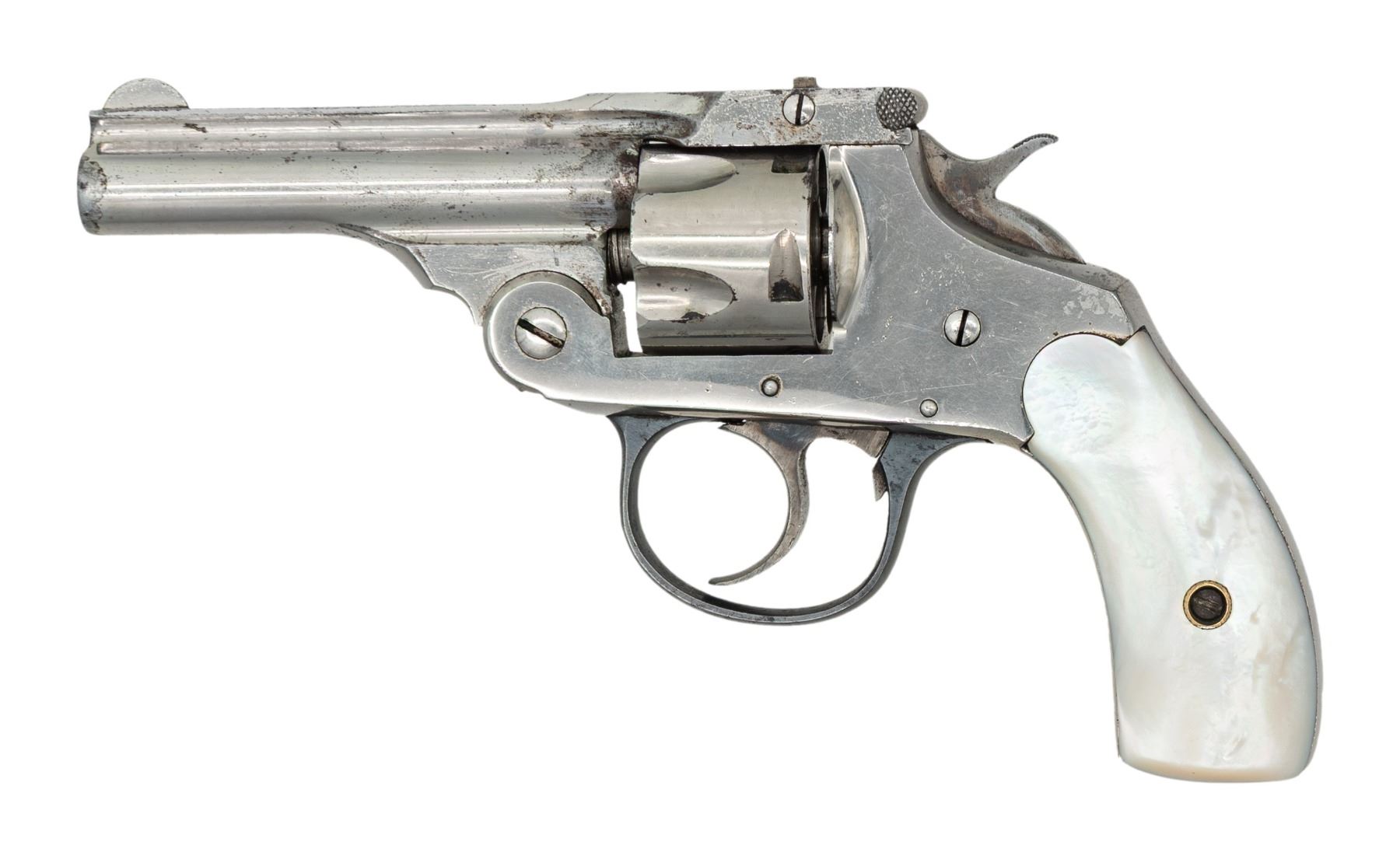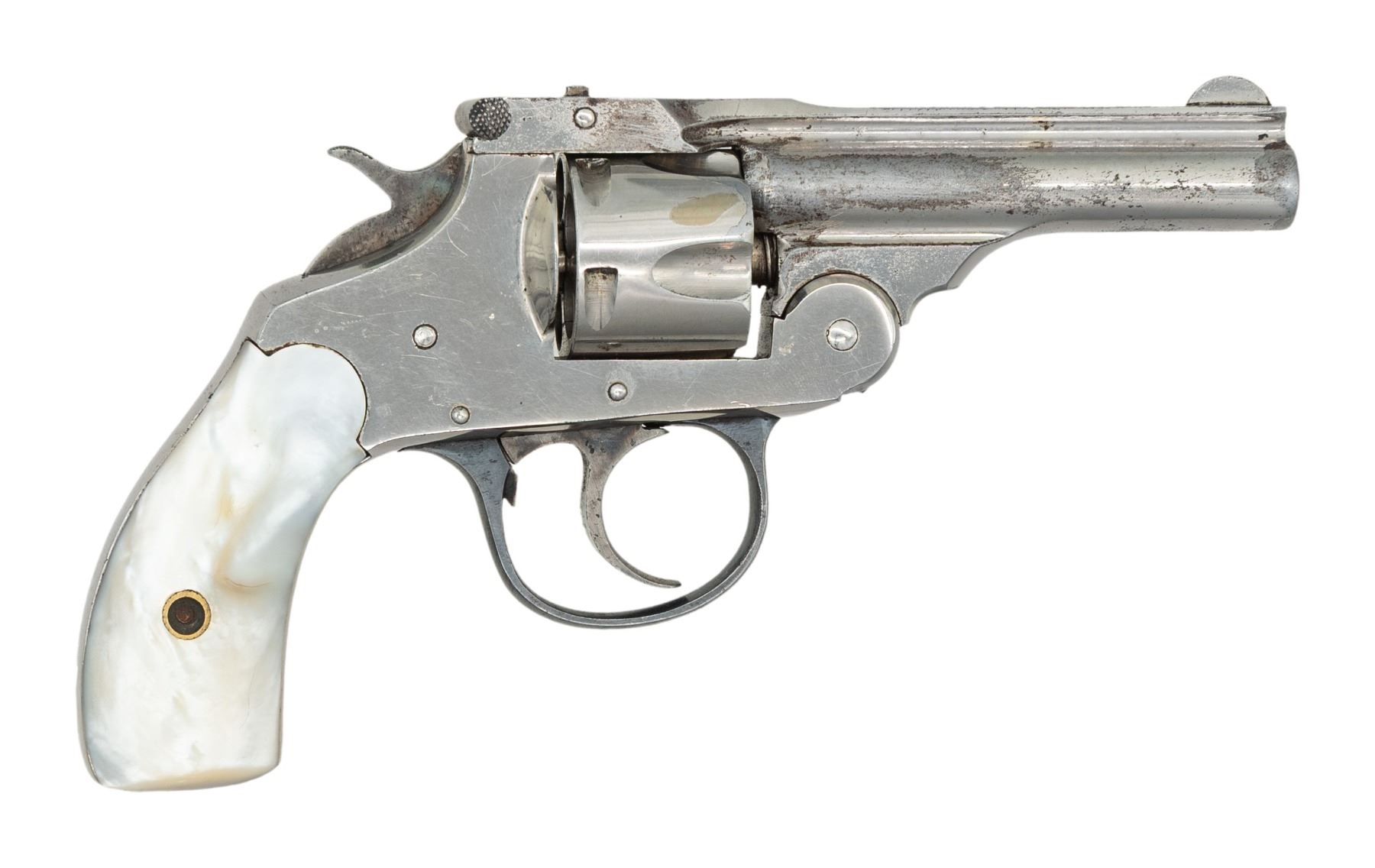 MODEL DA REVOLVER. Cal. 32 S&W. S# 11. Mfg. 1903-1905. Matching numbered 3" bbl. Nickel finish. 5 Shot cyl. Two piece mother of pearl grips. CONDITION: good nickel peeling along edge & scratches. Good grips. Good rifling. PROVENANCE: Paul Birkenstamm Collection. (25-6305/MD). CURIO. $75-125.