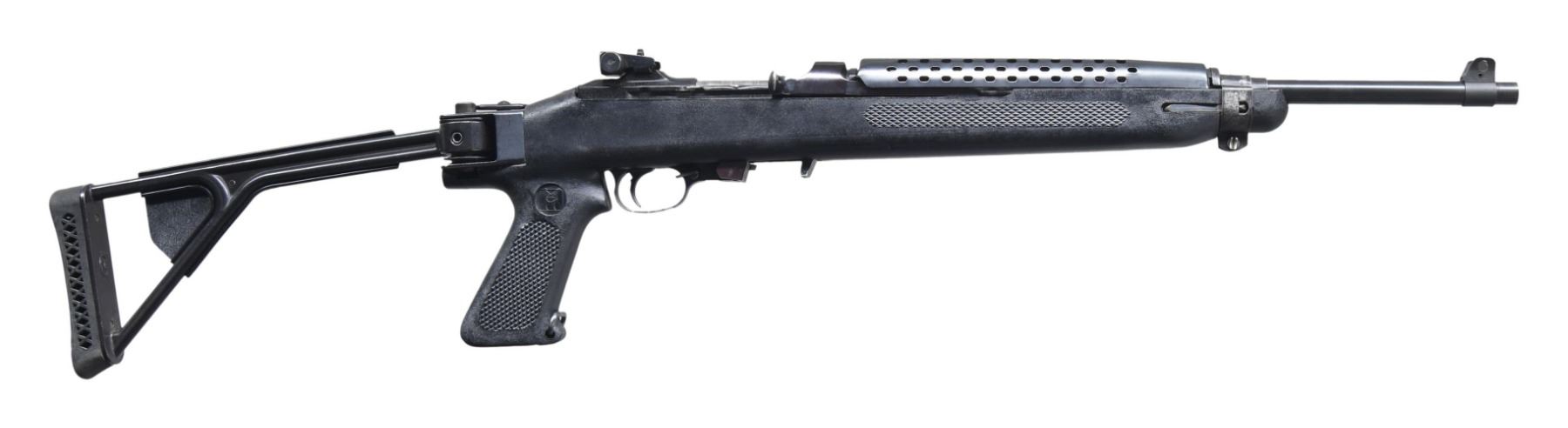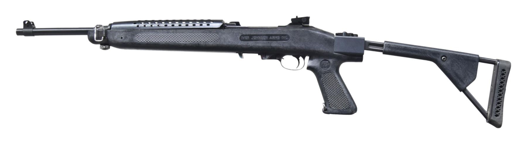 CARBINE. Cal. 9mm Luger. S# JJ01602. Bbl. 16 1/4". Rifle manufactured in the GI style & equipped w/ Iver Johnson side folding nylon pistol grip stock & ventilated metal handguard. Stamped aperture adjustable rear sight. Blade front sight w/ protective ears. Receiver is marked on top "IVER JOHNSON'S ARMS / 9MM PARABELLUM / JACKSONVILLE AR". Stock markings include "IVER JOHNSON ARMS INCORPORATED" & "owl logo". Ventilated rubber buttpad. Integral pistol grip. MAGS: none. CONDITION: finish on stock & metal has light wear & scattered small handling marks. Very good shiny bore. (25-2234/RW). MODERN. $300-500.