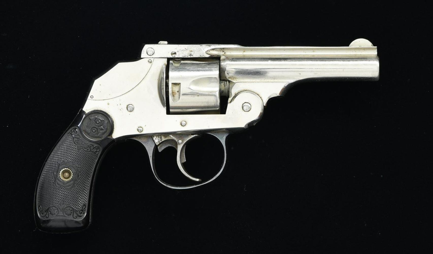 Cal. 32 S&W. S# 27101. Bbl. 3". Round blade front sight. Fixed rear sight. Nickel finish. Blued trigger guard. Checkered rubber grips. CONDITION: grips show some handling wear & light scratches. Metal retains 85% original nickel w/ some scattered flaking, light scratches & oxidation. Good bright bore w/ a couple patches of pitting & oxidation. (23-2732/MJC). CURIO. $200-300.