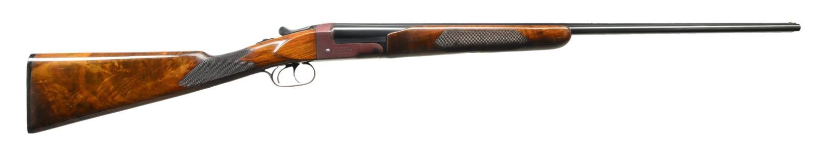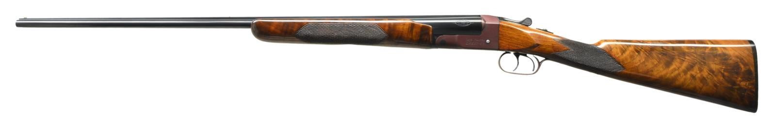Cal. 410, 3". S# 2729E. Bbls. 26" w/ raised solid rib having ivory front & mid beads. Rare choking combination, right bbl. is full & left bbl. is mod. Boxlock top lever action w/ top tang safety. Dbl. triggers. Selective ejectors. Beavertail forearm & straight grip stock of gloss finished fancy walnut w/ point pattern hand checkering. LOP: 14 1/8" over original owl's head buttplate. Drop at parallel comb: 1 7/16". Stock has approx. 1/4" cast off for right hand shooter. WEIGHT: 6 lbs., 7 oz. CONDITION: beautifully polished & refinished metal. Bbls. retain 98% brightly polished reblued. Receiver & trigger guard have a luxurious plum coloration. Hammer pin is polished. Original wood finish shows light wear & crazing w/ scattered finish chips, scratches & marks. Bright near excellent bores. (21-2443/DS). CURIO. $3,250-4,500.