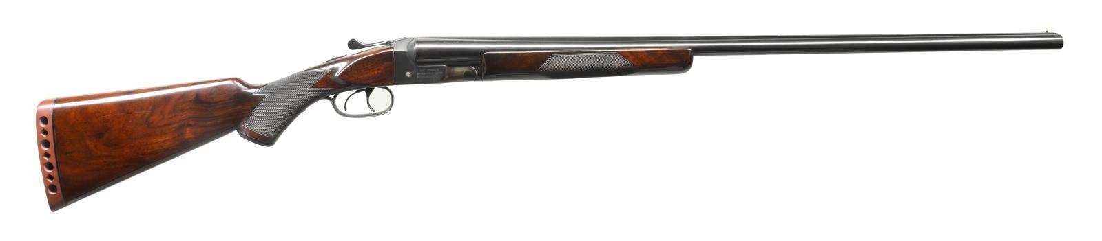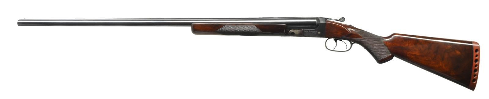 Cal. 20 Ga. S# 2183E. Bbls. 28" w/ brass front bead & ivory mid bead. Skeet In & Skeet out chokes. Blued boxlock action. Dbl. triggers. Ejectors. Beavertail forearm & capped pistol grip stock of fancy black walnut w/ hand checkering. LOP: 14 1/8" over unmarked red ventilated pad. DAC: 1 3/4". DAH: 2 3/4". Stock is cast off. WEIGHT: 7 lbs., 5.5 oz. CONDITION: bbls. retain 98% reblued finish. Reblued action finish is fading to plum in carry areas. Refinished stocks show light scratches. Freshened checkering. Very good bright bores. (21-2448/DS). CURIO. $1,200-1,800.