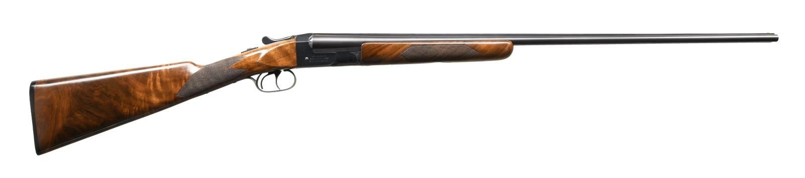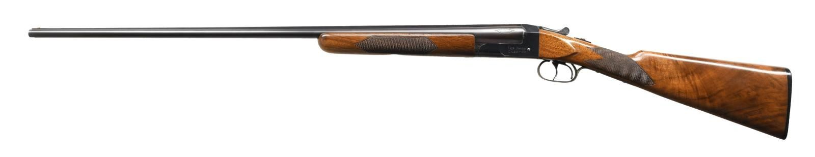 Cal. 410 ga. 3". S# 2658E. Bbls. 28" w/ white front bead. Fixed Skeet & Skeet chokes. Blued boxlock action w/ double triggers & ejectors. Beavertail forearm & straight grip stock of nicely grained walnut w/ hand checkering. LOP: 14 1/4" over original owl's head buttplate. DAC: 1 3/4". DAH: 2 7/8". Neutral cast. WEIGHT: 6 lbs, 6.6 oz. Mfg. 1931-33. CONDITION: bbls. retain 98% original blue. Action retains over 90% blue showing edge wear. Wood has added finish over a few light marks. Near excellent bores. (23-4806/DS). CURIO. $3000-4500.