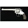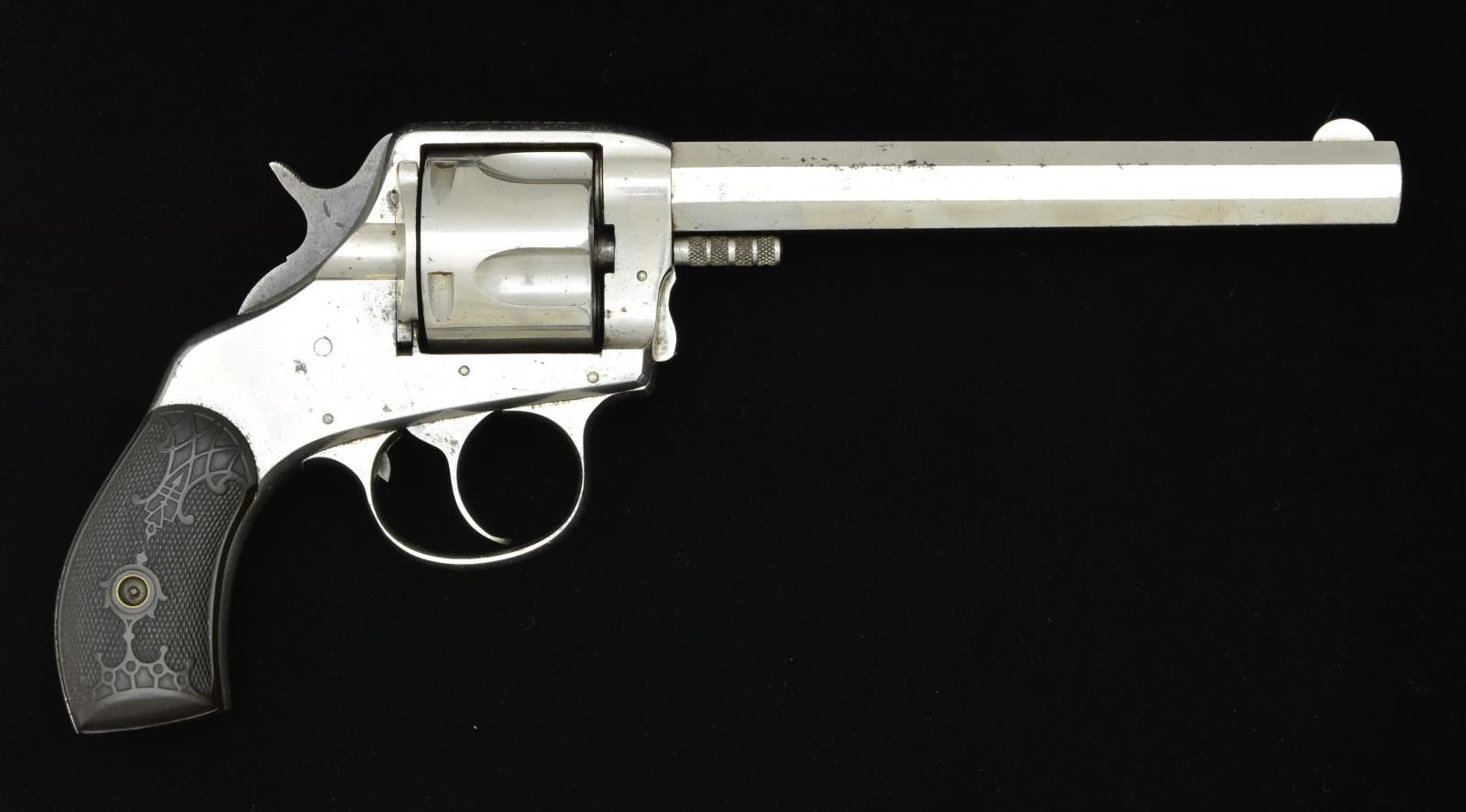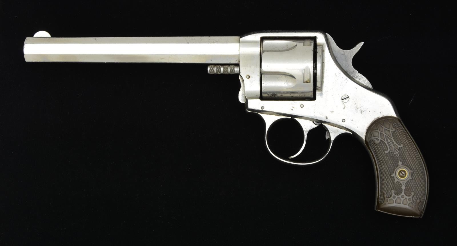 REVOLVER. Cal. 44 (no cal. marking, possibly 44-44). S# 301 (under left grip). Third variation w/ 6" oct. bbl. w/out markings & nickel trigger guard (mfg. 1888-1897). Half moon front sight. Nickel finish w/ case colored hammer. 5 Shot cyl. 2 Piece hard rubber grips. CONDITION: good nickel w/ peeling finish, peppery oxidation & handling marks. Very good grips w/ light handling marks. Good bore w/ strong rifling & light pitting. PROVENANCE: Estate Collection of Kenneth Horn (Grandson of JC Higgins). (01-20830/MD). ANTIQUE. $200-400.