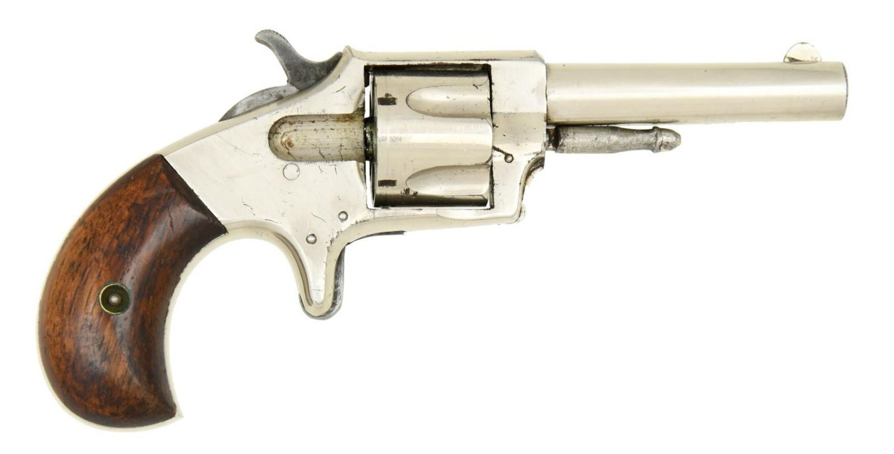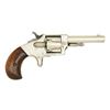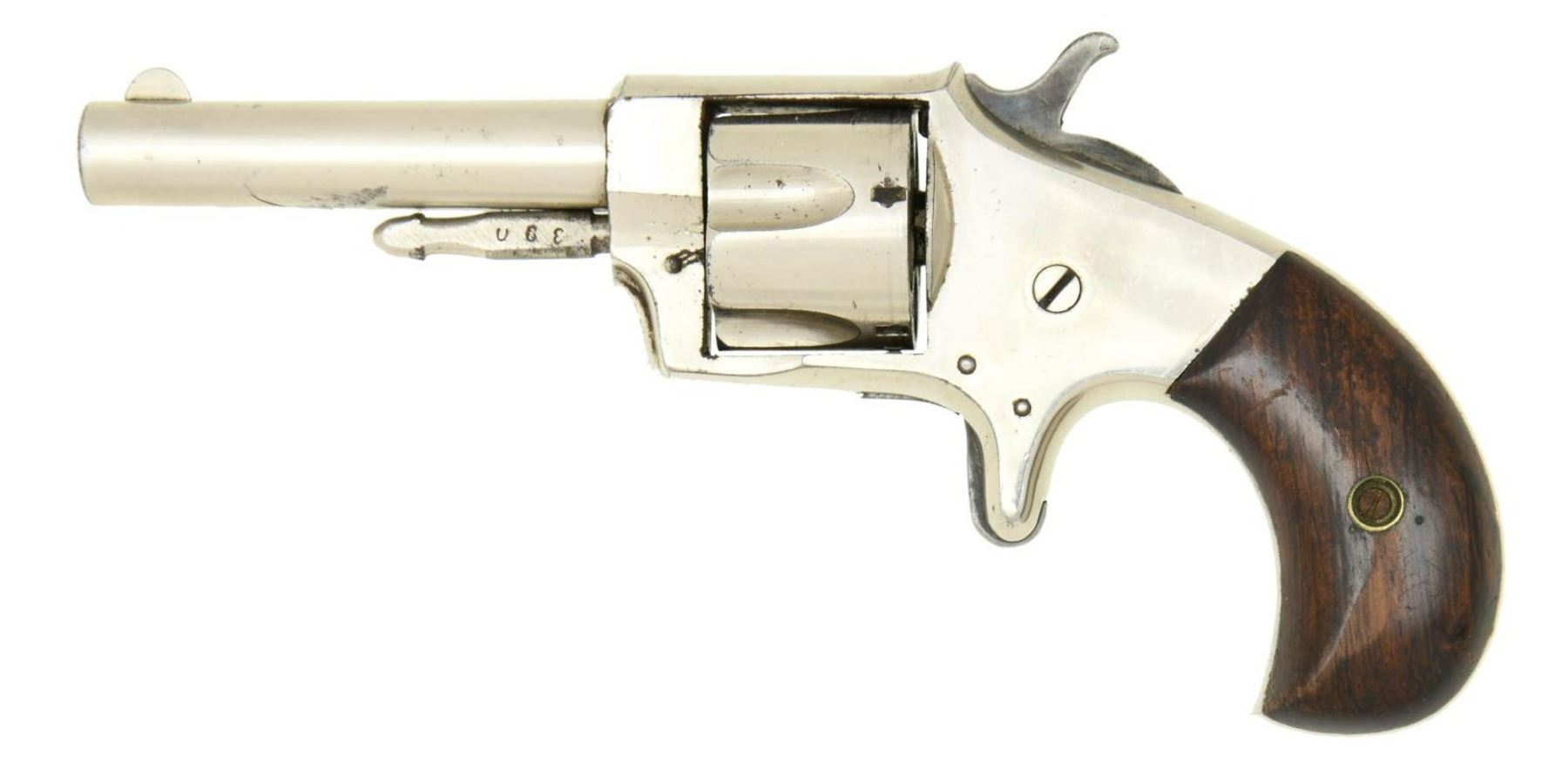 Cal. 32 RF. S# 4390. Bbl. 3". Round blade front sight. Fixed rear sight. Nickel finish. Smooth walnut grips. Top strap marked "TYCOON N22". Cyl. does not rotate when hammer is cocked. CONDITION: grips show scattered flaking, dings & handling wear. Metal retains 85% nickel w/ scattered dings, light flaking & some light oxidation. Pitted bore. (01-24227/MJC). ANTIQUE. $100-150.