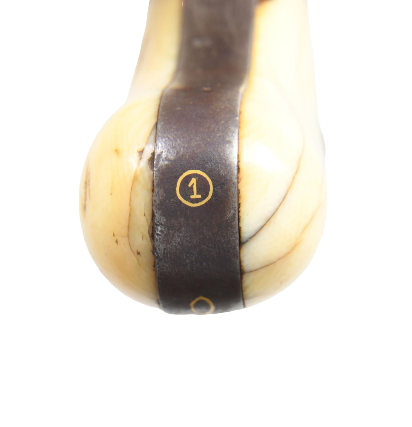 PISTOL. Cal. 31. S# 1. Overall 7.5", 3.5" barrel cluster stamped "BLUNT & SIMS NEW YORK, NY USA". Iron frame is scroll engraved & fitted with 2-piece ivory grips. "1" stamped on grip frame, gold "1" in circle on butt and gold highlight appears later addition. CONDITION: good overall. Brown patina, chip in one patinaed ivory grip. Ring trigger dbl. action mechanism functions, clear dark bores. (01-26636/JS). ANTIQUE. $600-800.