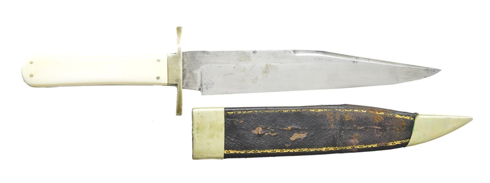 12” overall, 7.5" clip point blade, reinforced German silver crossguard, full tang, smooth ivory slab grips with vacant scutcheon. I*XL” on ricasso and “G. WOSTENHOLM & SON / WASHINGTON WORKS” & “THE HUNTERS COMPANION”, “I*XL” also embossed on scabbard in gold, attractive example. CONDITION: very good overall, blade gray/bright, old cleaning and polish partially removed 2 cyphers, Sheath is sound retaining much of its gold embossed decoration, missing frog button. PROVENANCE: From the Lifelong Collection of Glen E. Mattox. (02-18524/JS). $800-1,200.