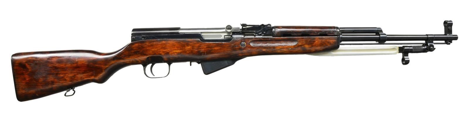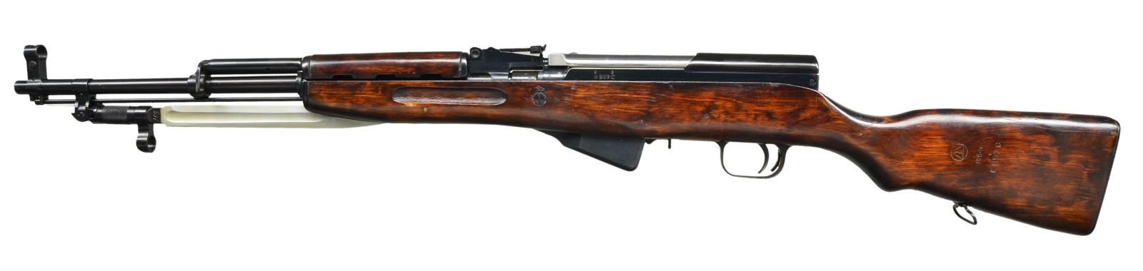 Cal. 7.62x39. S# B597S. Bbl. 20 1/2" w/ import marking. All visible matching numbers w/ bayonet, gas cyl. & rear sight electric pencil matching. Top cover marked w/ Izhevsk logo & 1954 date. 9" folding blade bayonet. Tangent rear sight graduated to 1000m. Post front sight w/ hood. Hardwood stock set w/ left side sling provisions. Left side of butt has Izhevsk cartouche w/ 1954 date. Cleaning rod present. UNATTACHED ACCESSIORES: unmarked importer box. CONDITION: stock set shows some minor flaking, light scratches & handling marks. Metal retains 95% original blue. Bright near excellent bore. (22-3479/MJC). CURIO. $500-800.