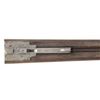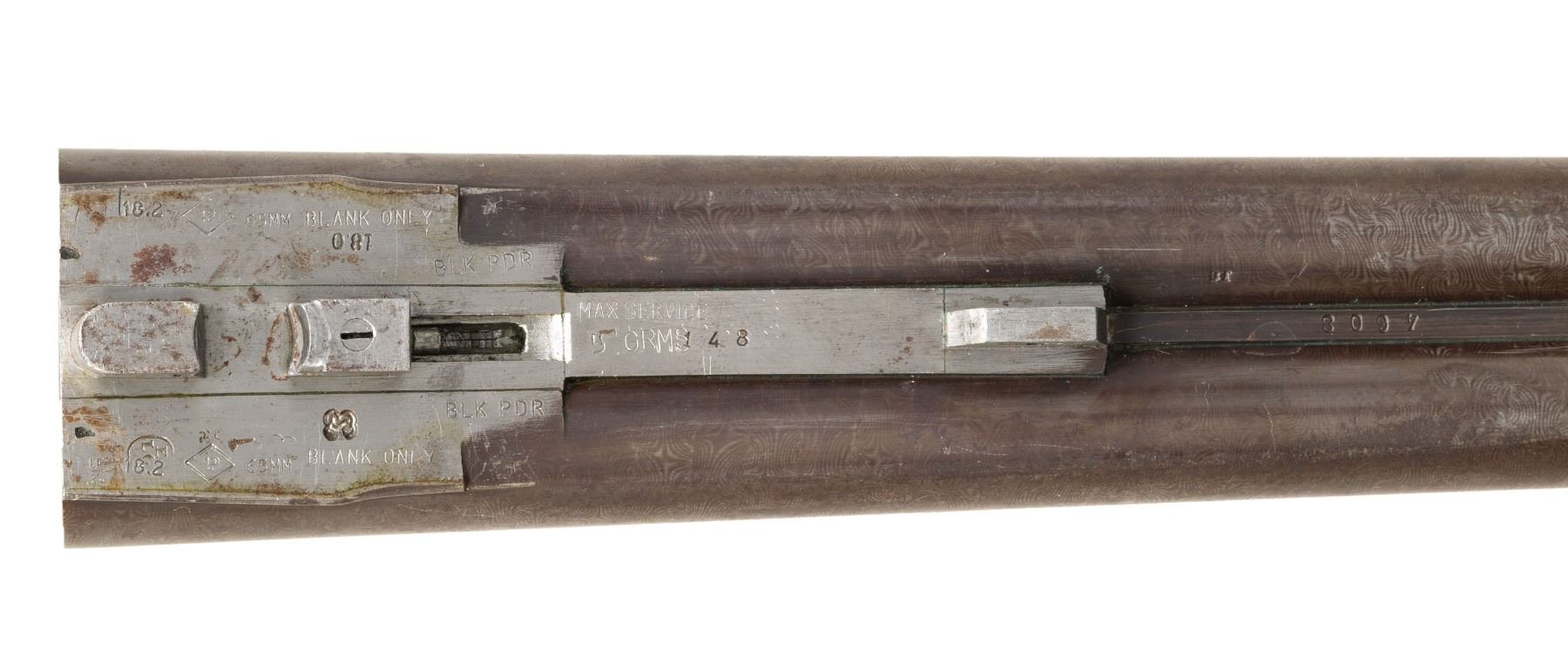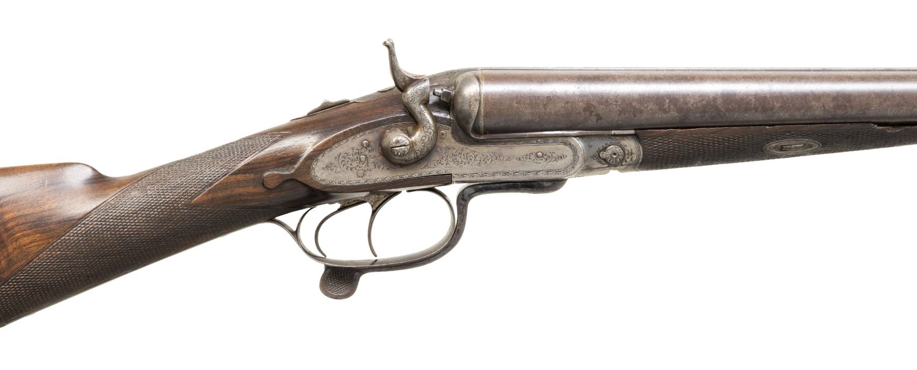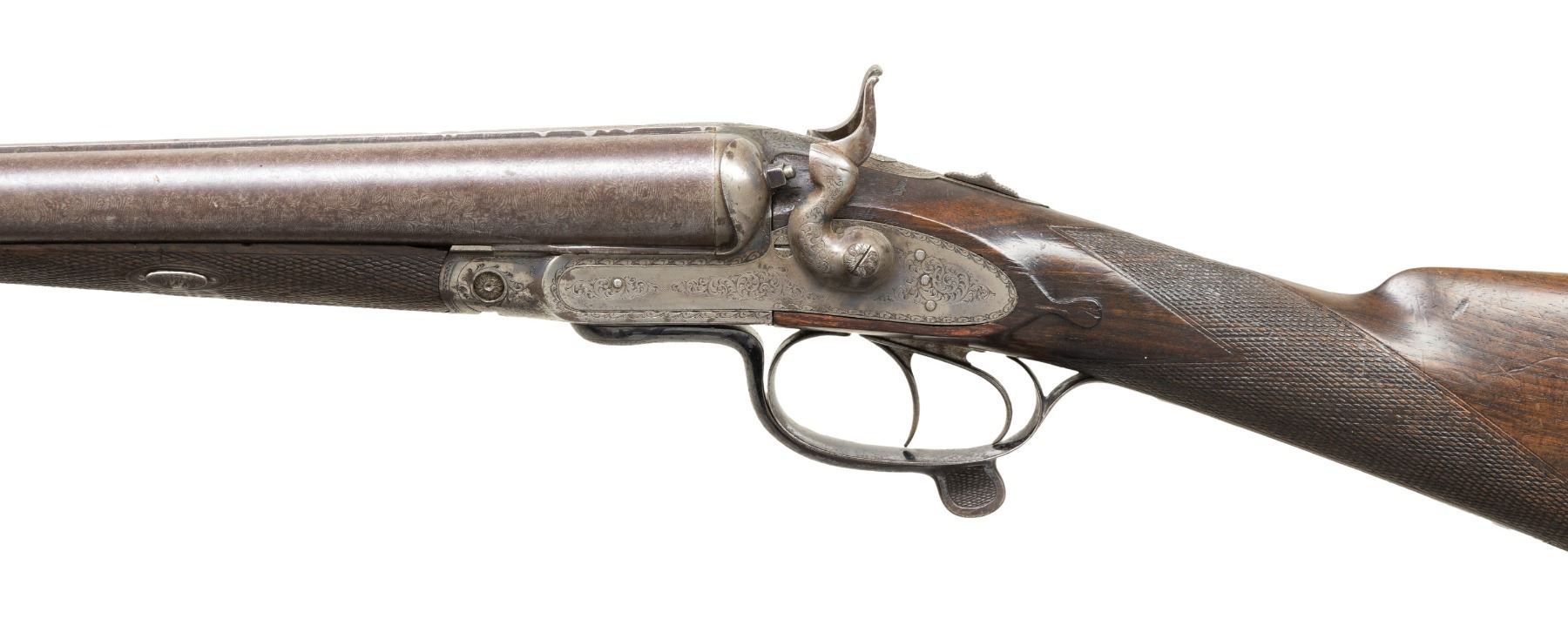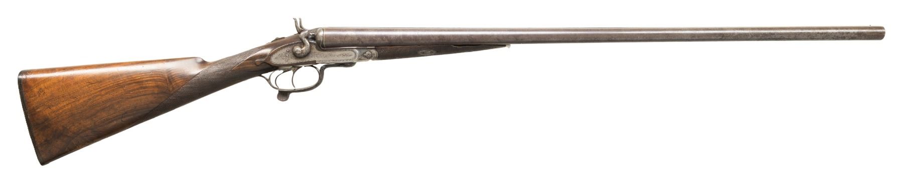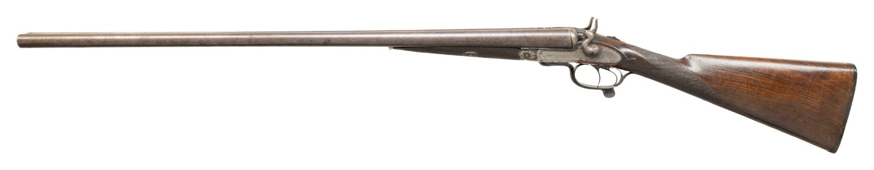 SHOTGUN. Cal. 12 Ga., 2 1/2" (Blank Only). S# 148. Mfg. approx. 1880's w/ pre 1893 Belgian black powder proofs along with 2024 London reproofs. Damascus 29 7/8" bbls. w/ front bead; chokes measure approx. Mod. Unusual left hand opening under lever action w/ top tang safety. Action & locks have sprays of acanthus scroll engravings. Checkered walnut stock set. Wedge fastened forearm w/ replacement white synthetic tip. Straight grip stock w/ tear drops behind locks & oval toeline plate. LOP: 13.5" w/ horn buttplate. CONDITION: barrels have gray patina appearance with scattered spots of corrosion & several dents to rib around breech section. Action has faded blue & case colors mixed with brown patina & marks. Wood shows numerous dings & scratches with worn finish in scattered spots & sm. chips at barrel channel of forearm. Bores show pitting. (01-28483/MD). ANTIQUE. $500-800.