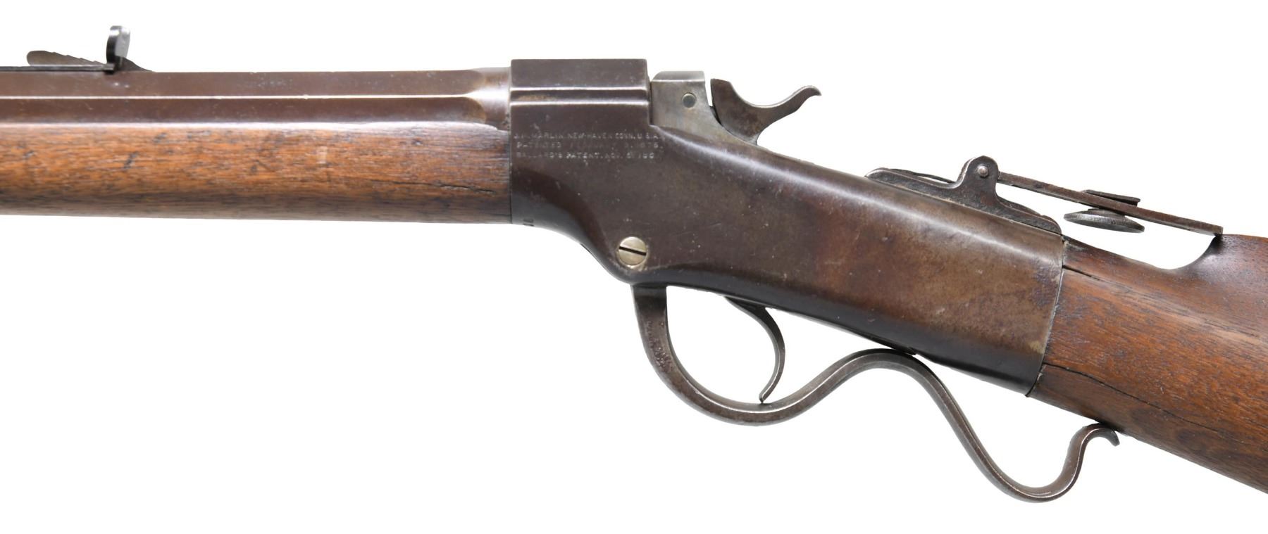 Cal. 44 W (44-40). S# 13028. Mfg. between 1875 to 1881 before the incorporation of the Marlin Fire Arms Company. Matching numbered oct. 30" bbl. Dovetail front sight base has replacement filed bone blade, original elevator rear sight & Marlin gallery peep sight. Walnut stock set w/ matching numbered crescent buttplate. CONDITION: balance of metal is brown patina appearance with spots of corrosion throughout. Well worn wood shows large cracks throughout, 2 wood plug repairs in buttstock, & screw repair along w/ replacement buttplate screw. Poor pitted bore. (01-27151/MD). ANTIQUE. $700-1,000.