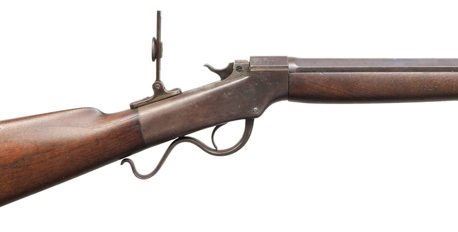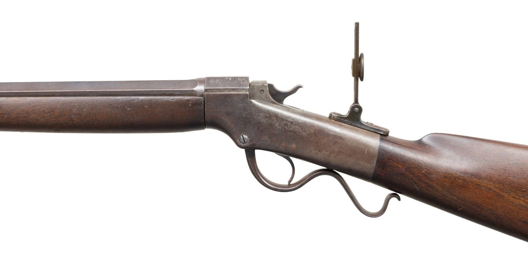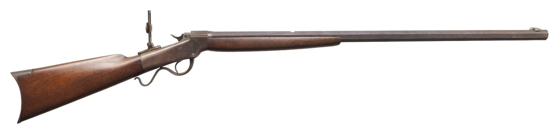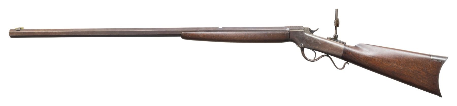 SPORTING RIFLE. Cal. 44 W (44-40). S# 7453. Matching numbered oct. 30" bbl. German silver blade front sight, open rear dovetail & sliding tang sight. Replacement walnut forearm w/ original straight grip walnut buttstock w/ crescent buttplate. CONDITION: metal has brown/gray patina appearance with faint blue where rear sight was, peppery oxidation, edge wear & handling marks. Wood has fair worn appearance with large cracks at head of wrist. Bore shows worn rifling with pitting. PROVENANCE: Estate of Groves Herrick. (01-28333/MD). ANTIQUE. $500-700.