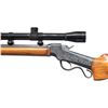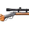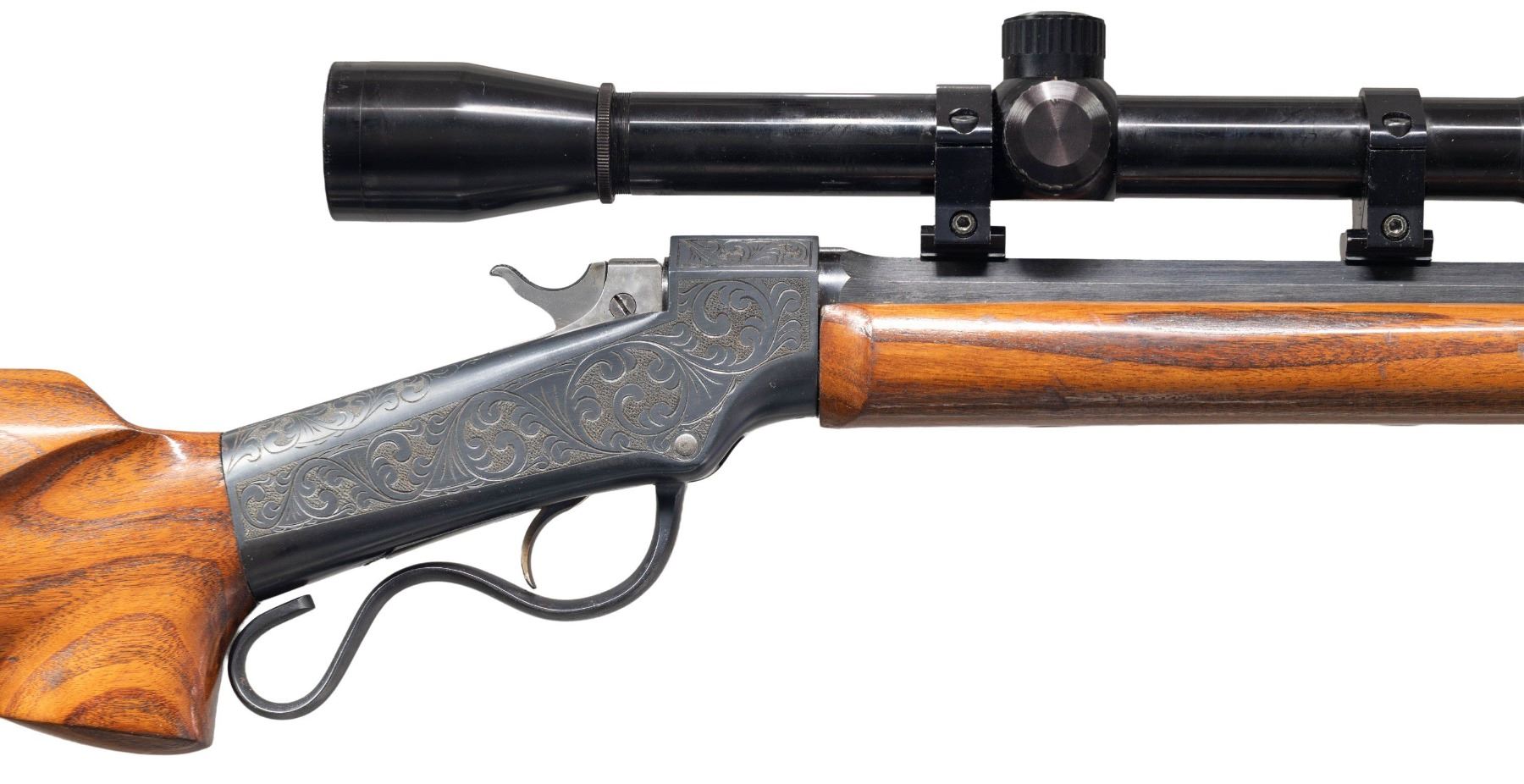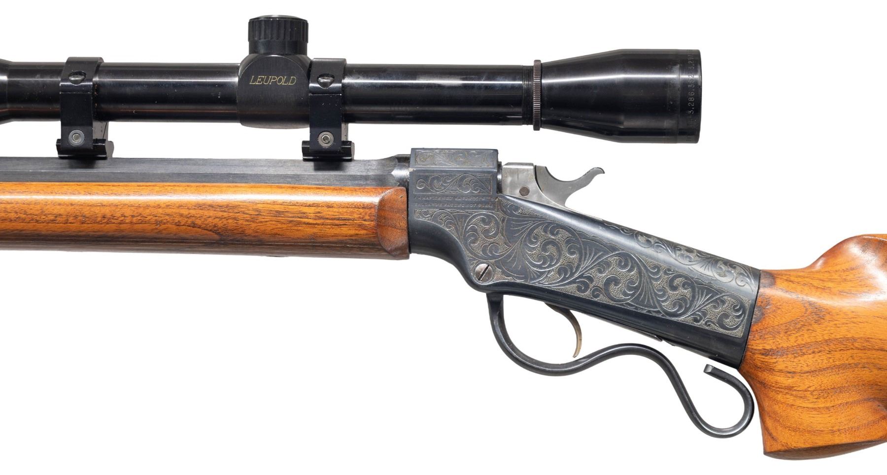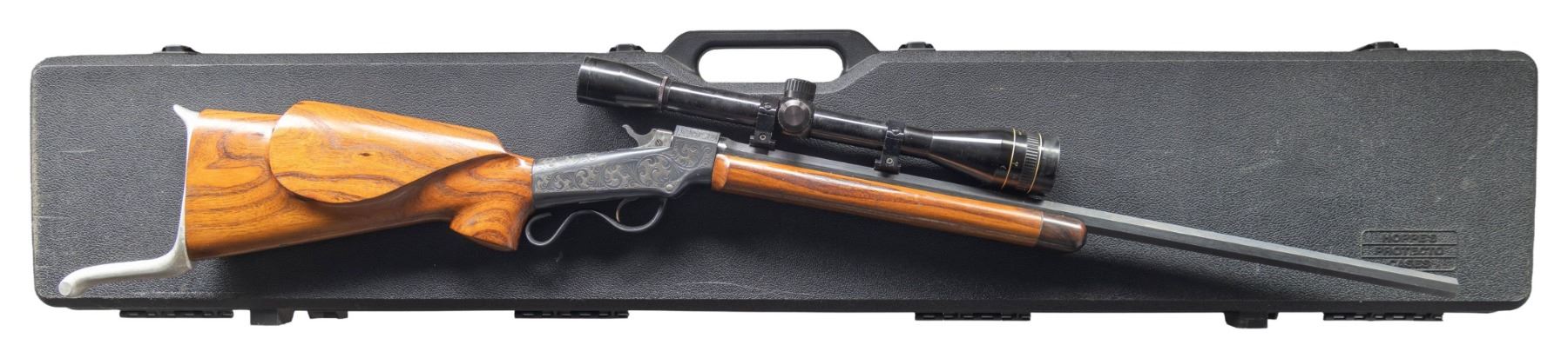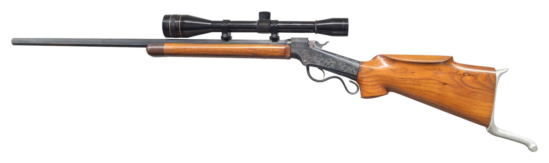 RIFLE. Cal.5MM Remington Centerfire. S#. 3441. Bbl. 25" tapered octagon. Unique custom target rifle built on a J. M. Marlin Ballard,ca. 1875-1881. The action has generous coverage of unsigned vine type foliate scroll hand engraving with punch dot backgrounds. The breech block is polished bright with jeweled sides. Custom stock & forend of exotic wood that may be Mesquite. Rosewood tipped wide target forend is fitted with a walnut palm rest. Pistol grip stock with a roll over cheekpiece is fitted with a Scheutzen style buttplate with a long lower prong. Leupold gloss finished 24X50 AO Target scope with fine dot reticle on Weaver style mounts. Consignor supplied information states "James Grant's personal rifle). UNATTACHED ACCESORIES: The rifle is held in a modern foam lined plastic case with cleaning rod, brushes and palm rest. Included is a 50 round box of 5mm Remington Magnum centerfire primed cases supplied by Schroeder Bullets, San Diego, CA. (formed from .22 Hornet cases). Also a box of Sierra Matchking .224 diameter 53 gr. HP bullets. This wild cat cartridge is dimensionally the same as the rimfire cartridge chambered in the Remington 591-592 series bolt action rifle in the early 1970's. CONDITION: over 98% reblued metal finish. custom stocks have good finish. Very good bore. PROVENANCE: From the Buckstix Collection. (01-28656/DS). ANTIQUE. $3,000-5,000.