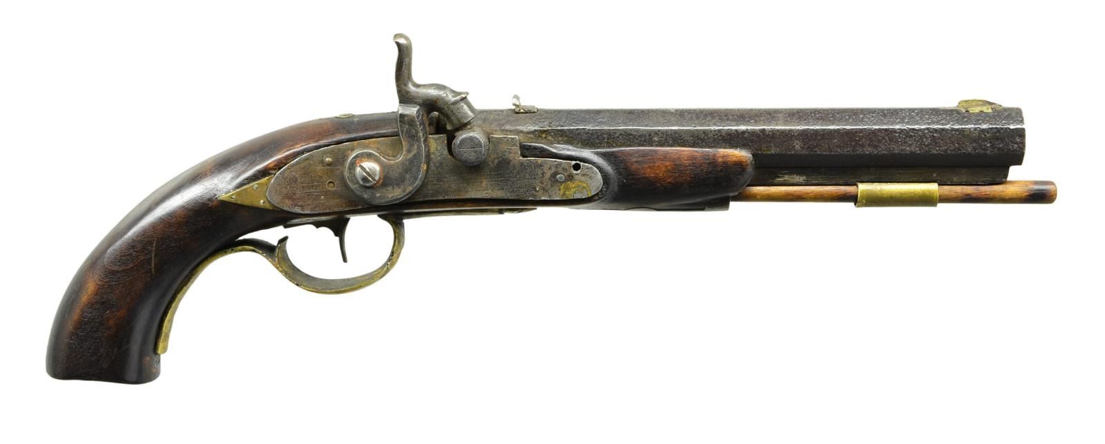 Cal. 38. NSN. Bbl. 8" smoothbore octagon. Top flat is marked “J. P. GUYER MUNCY PA”. Bolster type percussion conversion. Unmarked conversion lock. Stock is crudely made replacement. Flat fit brass trigger guard & side plate. Non-matching iron thimble. Replacement ramrod on iron under rib by single brass replacement pipe. CONDITION: bbl. exterior is heavily pitted. Lock shows spots of corrosion w/ brazed repair at lower front corner. Stock shows scratches & marks. Lock shows wear. Dark pitted bore. (01-22311/DS). ANTIQUE. $200-300.