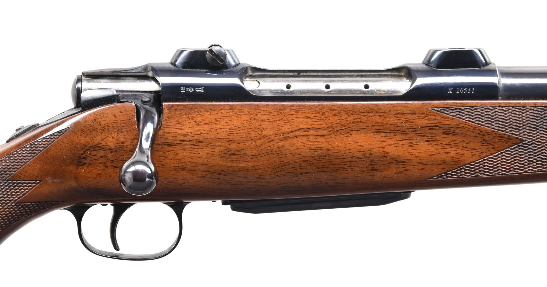 Cal. 7mm REm Mag. SN. K26511. 26" medium weight w/o sights. Glaasy smooth 3 lug action is fitted with scope bases. Monte Carlo cheekpiece stock of gloss finished walnut. Features include swivel bases, rose wood forend tip & grip cap w/ original recoil pad. Sigarms import marked. MAGS: 1 detachable 3 rd. CONDITION: near excellent, over 98% wood & metal finish. Bright near excellent bore. (24-2144/DS). MODERN. $2000-2900.