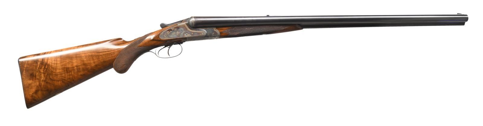 Cal. 12 ga. 2 5/8". / 6.5mm (appears to be 6.5x40Rmm). S# 122570. Bbl. 28" of Krupp Fluid Steel. Bead front sight w/ folding leaf bbl. rear sight & folding tang peep sight. Fixed mod & full chokes. Case colored sidelock action w/ side lever opening. Features include double under lug & crossbolt locking & top tang bbl. selector. Rifle cocking indicator is on top tang, shotgun cocking indicators are on lockplates. Action has 75% coverage of fine arabesque scroll w/ ornate borders that extends to trigger guard & forearm iron. Schnable tipped forearm & round knob pistol grip stock of checkered fancy European walnut w/ oval nameplate on toeline. LOP: 13 7/8" over a steel cartridge trap buttplate. DAC: 1 7/8". DAH: 3 3/8". WEIGHT: 7 lbs, 9.6 oz. CONDITION: over 90% lightly faded bbl. blue. Action retains 90% nicely visible case colors. Stock has good gloss finish showing scattered scratches & marks. Shotgun bores are very good & bright. Rifle bore retains sound rifling. (24-1239/DS). CURIO. $2,500-3,500.
