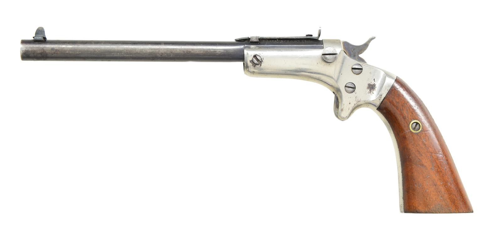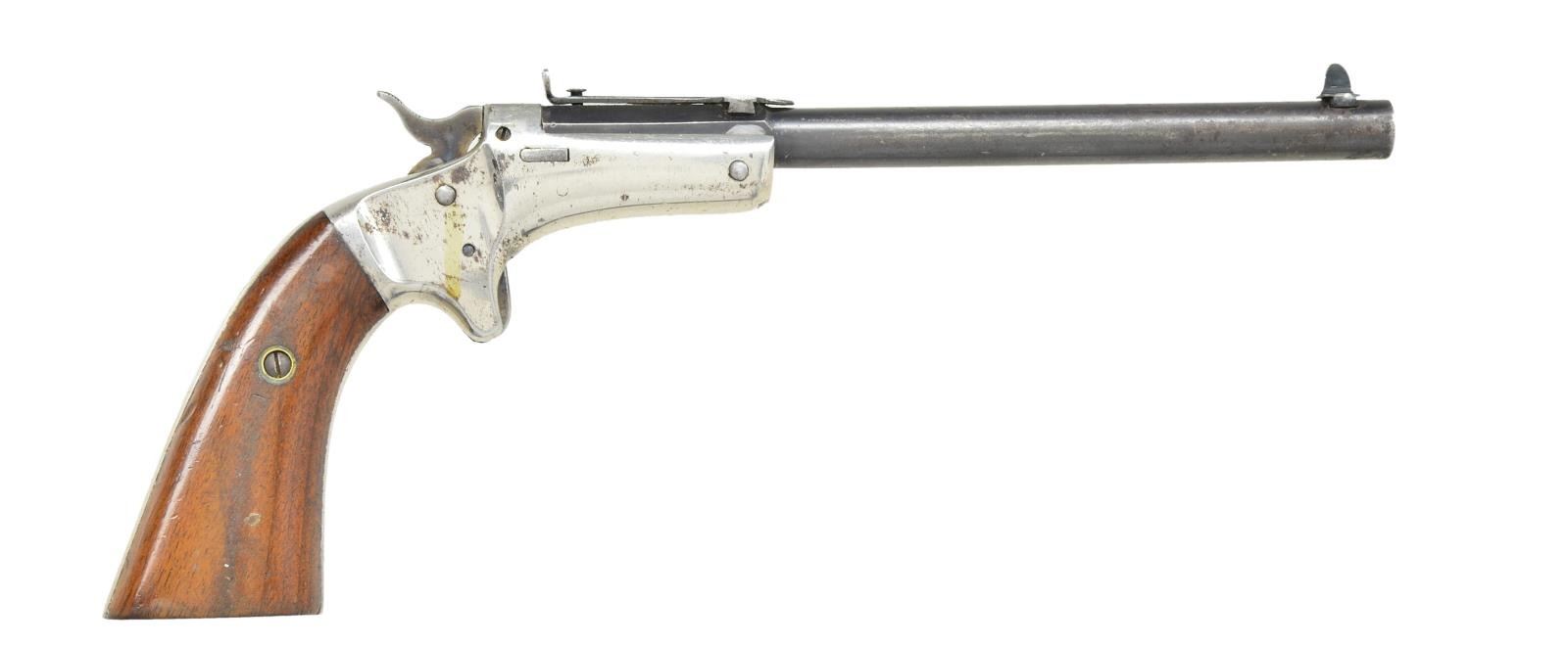TARGET PISTOL. Cal. 22 LR. S# 1854 (under grips, mfg. 1896-1916). Bbl. 6" w/ tall blade front sight & adj. open rear sight. Nickel plated steel frame w/ linkage extractor & internal firing pin, no bushing. Matching numbered 2 piece walnut grips. UNATTACHED ACCESSORIES: zippered case. CONDITION: Good blue fading to gray mixing w/ peppery oxidation & wear. Good nickel showing spots of worn finish showing dark patina. Good varnish w/ worn areas & dents. Good strong bore w/ light pitting. (23-18/MD). CURIO. $200-300.