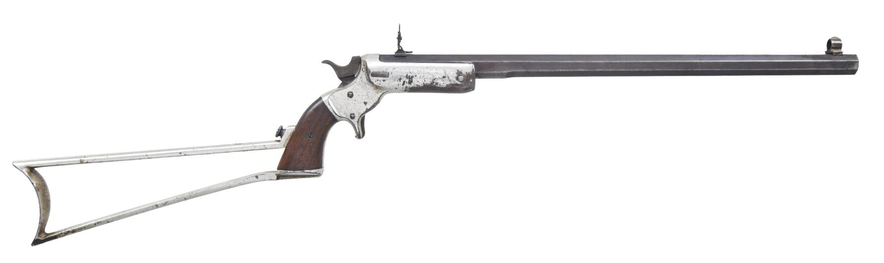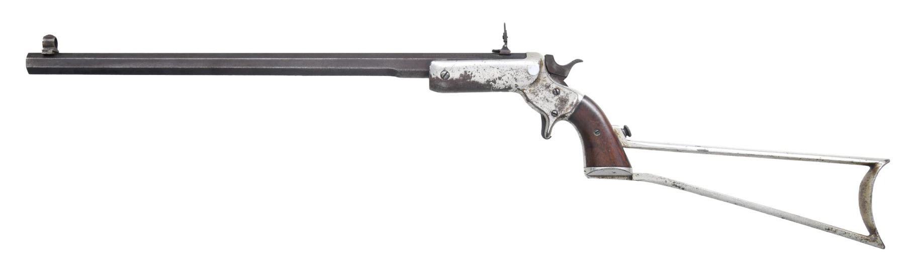 WITH MATCHING STOCK. Cal. 32 RF. S# 1665. Mfg. 1872-1900. Oct. 18" barrel with company marking "J STEVENS & CO CHICOPEE FALLS. MASS. PAT. SEPT. 6.1864"; The company changed names from J. Stevens & Co. to J. Stevens Arm & Tool Company in 1886. Combination globe & blade front sight and ladder aperture & V notch rear sight. Iron frame with replacement opening button, slot for shoulder stock & 2 piece walnut grips. UNATTACHED ACCESSORIES: matching numbered shoulder stock. CONDITION: barrel has faded blue mixing with brown patina & wear. Fair nickel showing large areas of peeled finish & oxidation. Bore shows deep pitting & worn rifling. (24-6947/MD). ANTIQUE. $300-500.