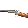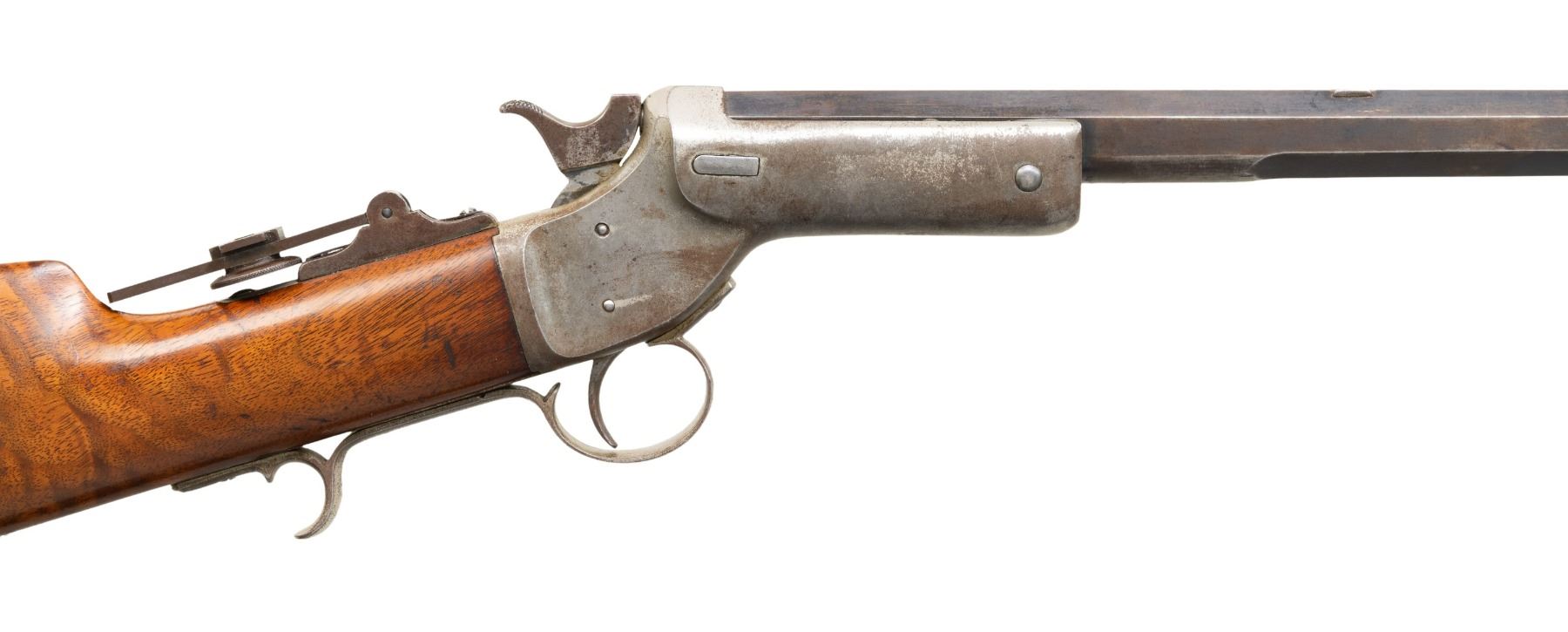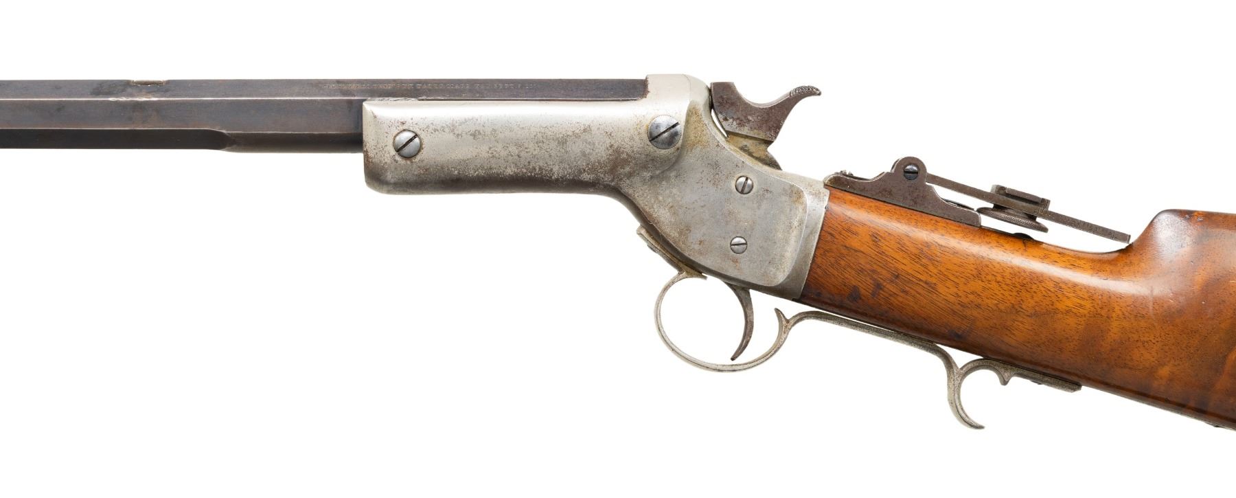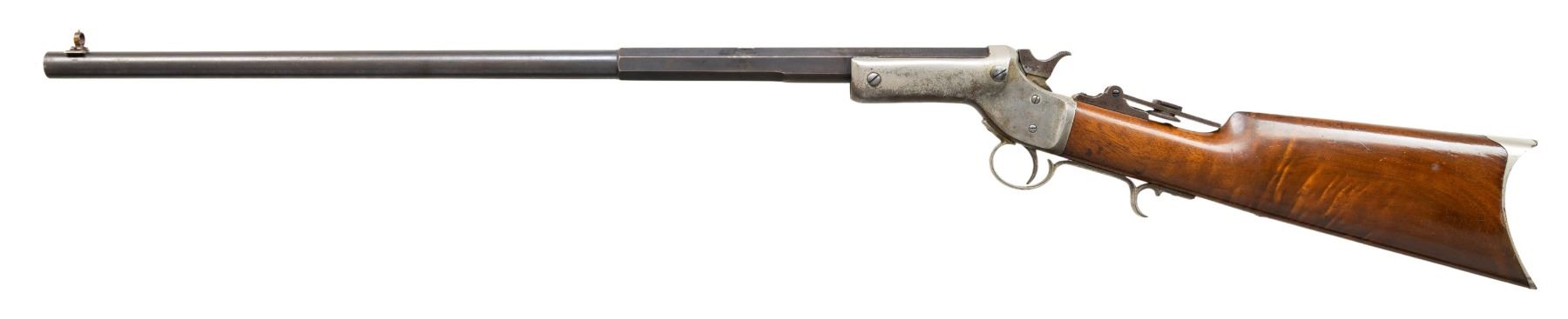 Cal. 22 Short. S# 15556. Appears to be a No. 2 style rifle without a forearm. Matching numbered half. oct., half rnd. 24" bbl. Combination globe front sight, filler in rear dovetail & vernier tang sight. Nickel finished action w/ mushroom opening button & finger rest triggerguard. Walnut buttstock w/ crescent nickeled buttplate. CONDITION: fair fading blue mixed with brown patina & peppery oxidation throughout. Fair fading nickel with oxidation & marks. Sanded & refinished wood has marks. Fair worn rifling. PROVENANCE: Estate of Groves Herrick. (01-28328/MD). ANTIQUE. $300-500.
