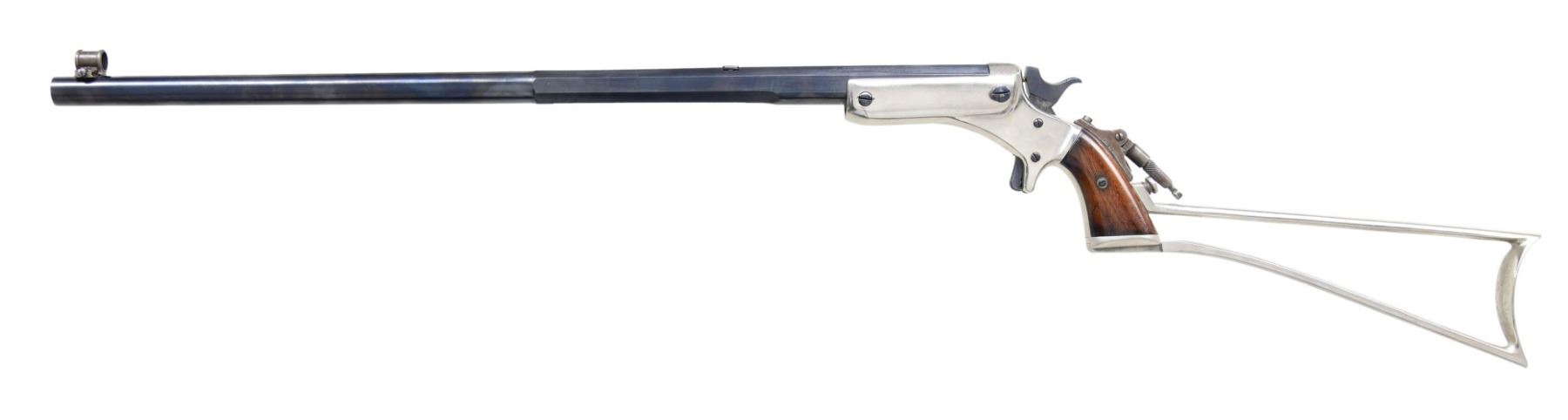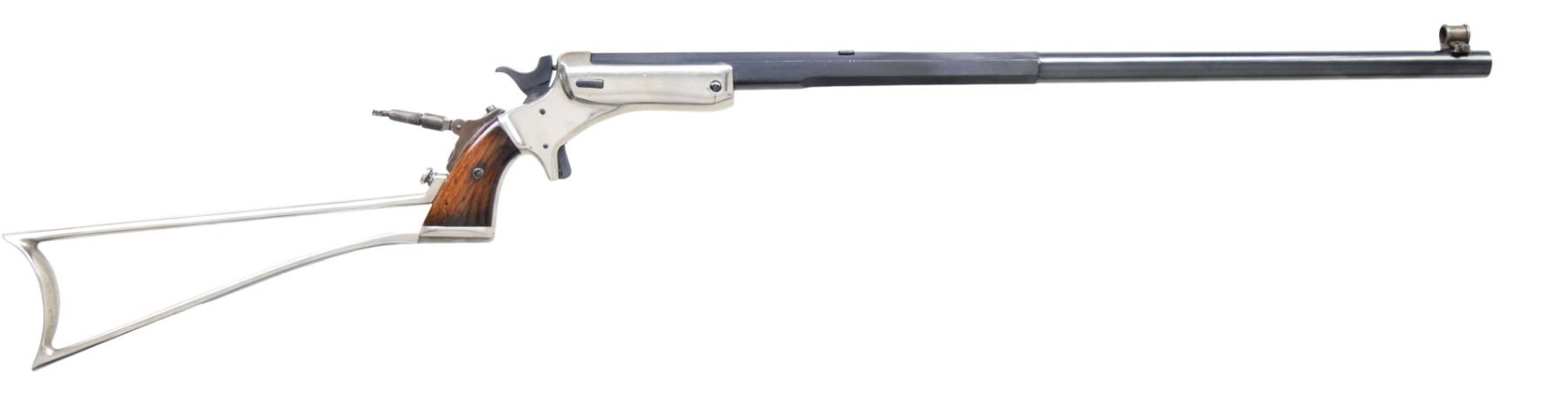 Cal. 22 RF. S# 3797. Bbl. 22" octagon to round. Globe front sight, filler in rear dovetail w/ combination tang sight. Nickel finished iron frame w/ center mounted hammer & spur trigger. 2 piece walnut grips. Detachable nickel finished iron shoulder stock that has a matching number. Estimated quantity of 4,000 mfg. 1872-1900. CONDITION: bbl., hammer & trigger retain 98% reblued finish. Action has 98% renickeled finish. Action & stock have 98% reblued finish. Refinished grips are slightly undersized showing some handling marks. Action shows slight looseness at breech. Lightly pitted bore w/ worn rifling. PROVENANCE: From the Collection of a Tennessee Gentleman. (24-4499/DS). CURIO. $1,200-1,800.