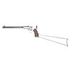 Cal. 22 LR. S# 29123. Bbl. 10" w/ beech style globe & post front sight & distinctive fixed rear sight. References list tang sight for backstrap; has Lyman No.1 tang sight. Approx. 2500 mfg. 1896-1915; identical to No. 40 but w/ fixed rear bbl. sight & tang sight. Nickel plated iron frame w/ left side marked "DR. J. A. DONOVAN" over "BUTTE." w/ decorative underlining. Matching numbered blued bbl. assembly w/ name & address plus correctly w/out patent date. Improved variation of New Model Pocket rifle having addition of trigger guard; includes matching numbered skeleton stock retained by bottom dovetail & thumbscrew on backstrap. Smooth walnut grips. CONDITION: good to very good w/ patina on bbl. & light marks on very good nickeled finish. Light dbl. curved bend in stock assembly as viewed from top or bottom. Very slight looseness in bbl. lockup. Light scratches on nickel w/ some peeling on buttcap & on left side near hammer. Good plus grips w/ very minimal finish; left best appearing. Good bright bore w/ light wear & hint of frosting. (22-2781/NW). CURIO. $800-1,200.