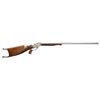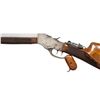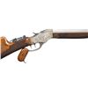 Cal.33-47 CF., using a .333 diameter bullet. S#. 2680. Bbl. 30 7/16" octagon round unmarked replacement style. Open dovetail for the front sight with a Stevens Wind Gauge Vernier tang sight having a No. 104 combination eye cup. No. 44 1/2 falling block action has a drop forged receiver for smokeless powder pressures. Features include: double set triggers, No. 6 Schuetzen Special lever with wood grip inserts and ripple pattern case colors. The Model 54 was Stevens highest grade featuring scroll engraving with game scenes having a bear on the right & a bull elk on the left. Perch belly cheekpiece stock & schnable tip forearm of fancy black walnut w/ elaborate hand checkering. Schuetzen style buttplate is case-colored. CONDITION: the receiver retains lightly visible case colors on protected top & bottom areas. Right side of receiver shows spots of light pitting. The original wood finish shows light wear w/ scattered scratches & marks. The checkering shows some chipped diamonds. The action has a stiff operation when opened & closed. Properly functioning triggers. The replacement style barrel is polished in the white retaining a near excellent bore with non-pope style rifling. (25-6628/DS). CURIO. $1,500-2,000.