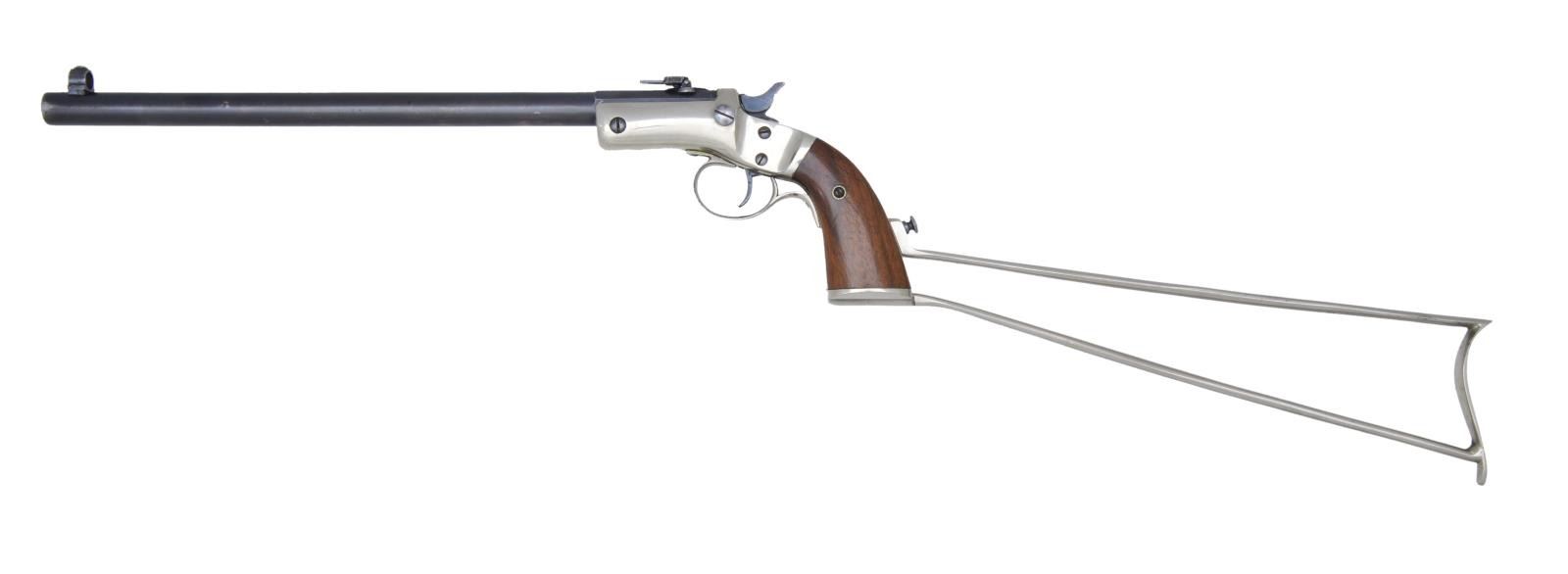 RIFLE. Cal. 22 LR. S# 25374. Bbl. 12" round with octagon shank having combination globe front sight and folding leaf rear sight. Nickel finished action. 2 Piece walnut grips. Matching numbered nickel finished detachable shoulder stock. Estimated quantity of 15,000 mfg. 1896-1916. CONDITION: 80% lightly worn barrel blue. Action and stock retain 98% nickel. Original grip finish shows scattered scratches and marks. Lightly pitted bore retains intact rifling. (22-2780/DS). CURIO. $900-1,300.