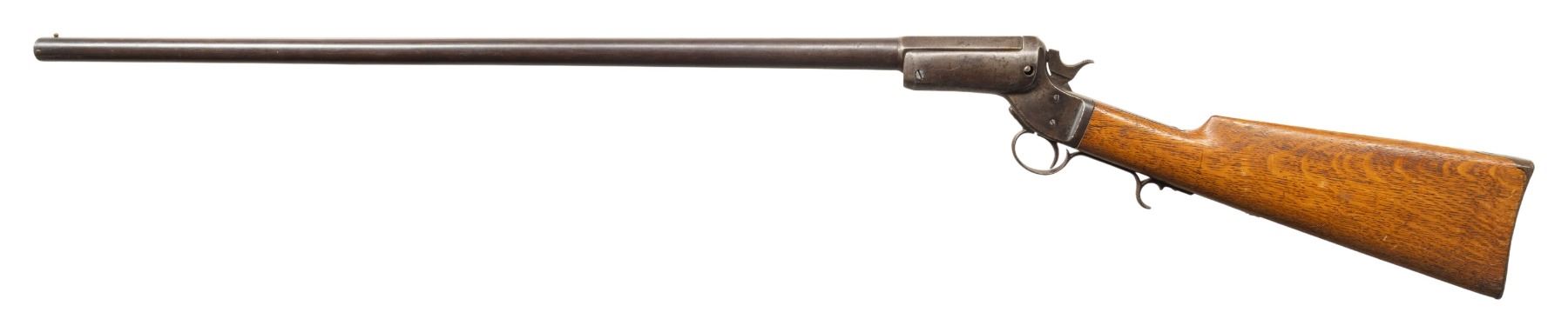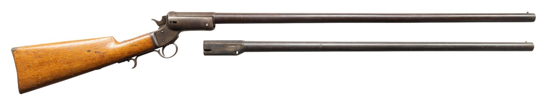 Cal. 12 Ga. S# 6805. Bbl. 30 1/4" w/ steel bead & Full choke. Tip up action w/ finger rest triggerguard; missing opening button, crossbolt, extractor & link. Replacement hardwood buttstock w/ curved buttplate. UNATTACHED ACCESSORIES: additional 28", cal. 12 Ga. barrel numbered "4879" w/ brass bead. Barrel shows fading brown mixing with brown patina, marks & pitting. Pitted bore. CONDITION: balance of barrel is brown patina with oxidation & marks. Receiver & chamber portion of barrel is cleaned gray appearance with pitting, oxidation & marks. Fair wood finish. Pitted bore. PROVENANCE: Estate of Groves Herrick. (01-28311/MD). ANTIQUE. $300-500.