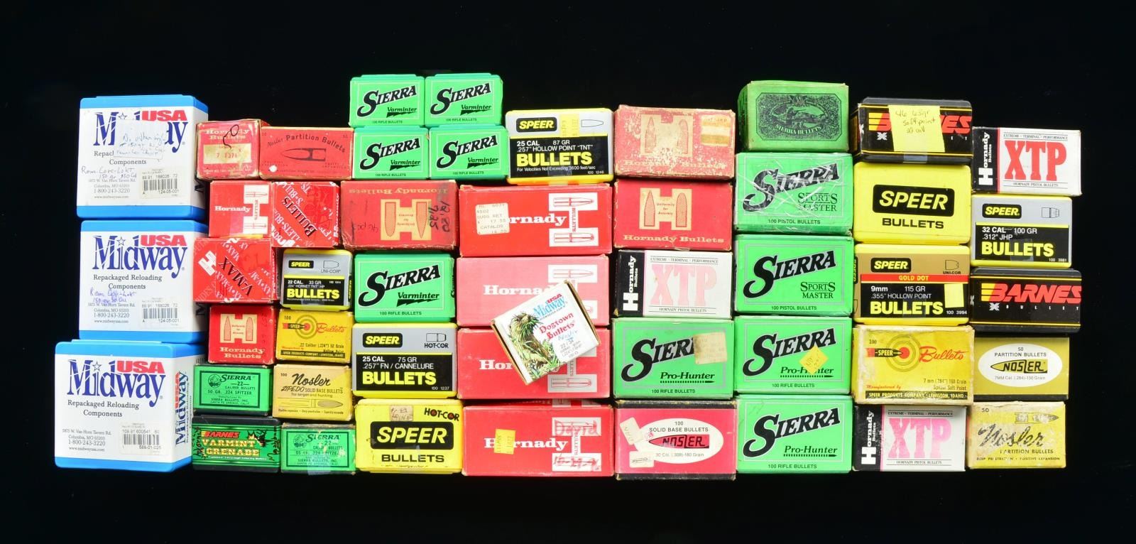 All very good to excellent and ready to use. 92 Boxes; 42 full and 50 partial boxes. Full boxes of 100 unless noted. FULL BOXES: 1 boxes .257 Hornady 60 gr. SP. / 1 box .257 Hornady 60 gr. FP. / 1 box .257 Remington 60 gr. HP. / 1 box .257 Speer 87 gr. HP TNT. / 1 box .257 Hornady 75 gr. V-Max. / 1 box .257 Sierra 117 gr. Spitzer BT. / 3 boxes .224 Midway Dogtown 55 gr. Spitzer. / 2 boxes .224 Midway Dogtown 50 gr. Spitzer. / 1 box .224 Midway Dogtown 34 gr. FBHP. / 1 box .224 Hornady 52 gr. BTHP Match. / 1 box .224 Hornady 45 gr. HP-Bee. / 1 pack .357 Winchester 125 gr. JHP-Notched. / 1 box .355 Speer Gold Dot 124 gr. HP. / 1 box .355 Speer Gold Dot 115 gr. HP. / 1 box .312 Hornady 85 gr. HP-XTP. / 2 box .400 Hornady 180 gr. HP-XTP. / 1 box (50) 6.5mm Nosler Partition 140 gr. Spitzer. / 1 box. .264-6.5mm Speer 120 gr. Spitzer. / 2 boxes .308 Sierra 165 gr. Spitzer BT. / 2 boxes .338 Hornady 33 Win. 200 gr. FP. / 1 box .338 Hornady 200 gr. FP. / 1 box .338 Hornady 250 gr. RN. / 1 box .355 Hornady 115 gr. HP-XTP. / 1 box .348 Hornady 200 gr. FP. / 1 box .458 Midway 45-70 repackaged Remington 300 gr. SP. / 2 boxes .308 Midway repackaged Remington 150 gr. Cor-Lokt. / 1 box (20) .458 Barnes 300 gr. XFN cannelured. / 1 box 7mm Speer 160 gr. S-SP. / 1 box (50) 7mm Nosler Partition 160 gr. SP Spitzer. / 1 box (50) 7mm Nosler Partition 150 gr. SP Spitzer. / PARTIAL BOXES: (75) .458 Midway 45-70 repackaged Remington 300 gr. HP. / (50) .338 Hornady 33 Win. 200 gr. FN. / (9) .458 Hornady 350 gr. RN. / (9) .458 Sierra 350 gr. multi grooved FN. / (20) .458 Sierra 350 gr. FN. / (15) 7mm Nosler Partition 140 gr. Spitzer. / (18) 7mm Hornady 139 gr. Spire Point. / (30) 7mm Hornady 154 gr. Spire Point. / (16) 7mm Speer 115 gr. HP. / (15) 7mm Nosler Partition 140 gr. Spitzer. / (11) 7mm Nosler Partition 160 gr. Spitzer. / (33) 7mm Speer 160 gr. S-SP. / (21) 7mm Barnes 175 gr. RN Solids. / (80) .312 Speer 100 gr. JHP. / (60) .355 Speer 125 gr. JSP. / (70) .355 Speer Gold Dot 115 gr. HP. / (18) .355 Hornady 100 gr. FMJ. / (40) 9mm Sierra 90 gr. JHC. / (70) .357 Sierra 158 gr. JSP. / (80) .357 Sierra 158 gr. JSP. / (70) .312 Sierra 85 gr. HP-XTP. / (84) .312 Sierra 100 gr. HP-XTP. / (40) .224 Midway Dogtown 34 gr. FBHP. / (43) .224 Sisk 63 gr. SP. / (50) .308 Sierra 170 gr. 30-30 FN. / (30) .308 Sierra 150 gr. Spitzer. / (22) .308 Sierra 125 gr. Spitzer. / (12) 30 Cal. Nosler 180 gr. Solid Base Spitzer BT. / (42) 270 Cal. Nosler Partition 150 gr. SP Spitzer. / (20) 25 Cal. Nosler Solid Base 120 gr. BT. / (61) 25 Cal. Hornady 75 gr. V-Max. / (46) .257 Hornady 120 gr. HP. / (39) .257 Speer Hot-Cor 75 gr. FN Cannelure. / (62) .257 Sierra 87 gr. Spitzer. / (60) .224 Hornady 53 gr. Match HP./ (50) .224 Hornady 60 gr. Spire Point. / (18) .224 Sierra Semi Point. / (50) .224 Sierra 50 gr. Spitzer. / (42) .224 Sierra 45 gr. SP Hornet. / (70) .224 Nosler Zipedo 55 gr. Solid Base. / (52) .224 Sierra 50 gr. Spitzer. / (64) .224 Barnes 36 gr. HP. / (28) .224 Speer 33 gr. Hornet TNT HP. / (62) .224 Speer 52 gr. HP. / (73) .224 Hornady 50 gr. Spire Point. / (38) .224 Speer 63 gr. SP. / (29) .257 Nosler Partition (in Sierra box) 117 gr. SP. / (10) .257 Hornady 75 gr. Spire HP. / (12) .257 Speer 87 gr. HP TNT. / (13) .224 Hornady 60 gr. Spire HP. / (10) .224 Sierra 53 gr. HP. PROVENANCE: Estate of Frank Glenn Marsh. (02-17058/NW). $350-500.