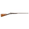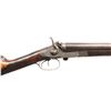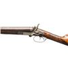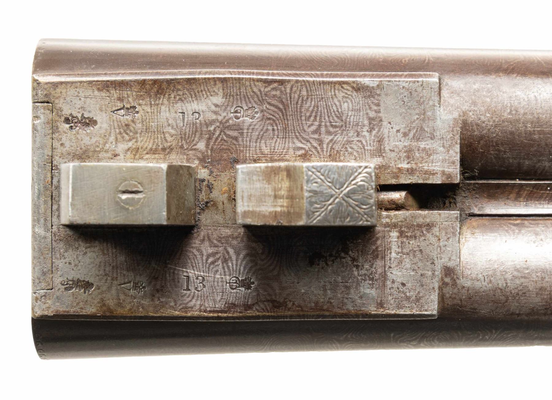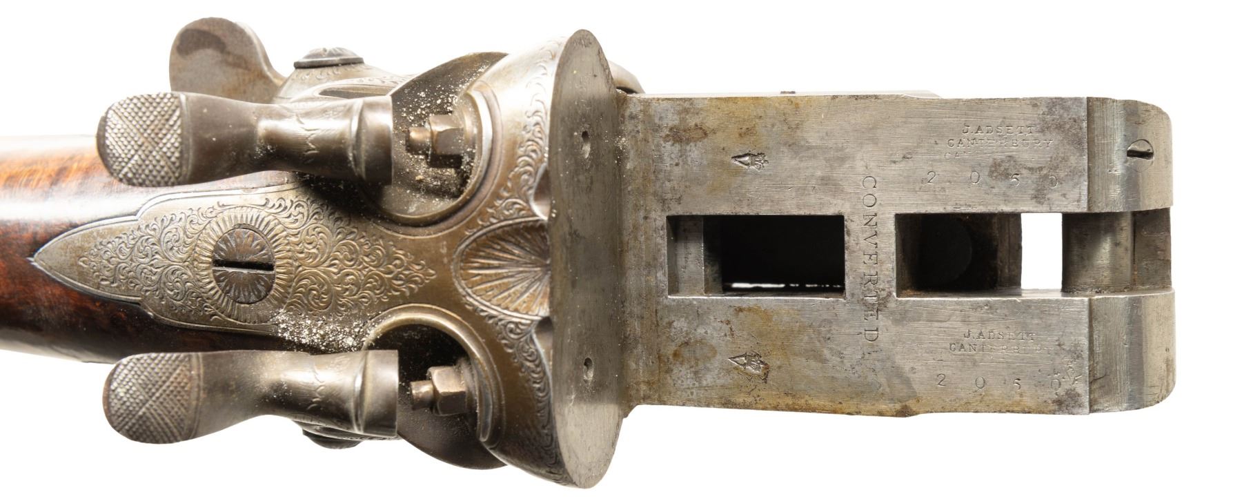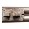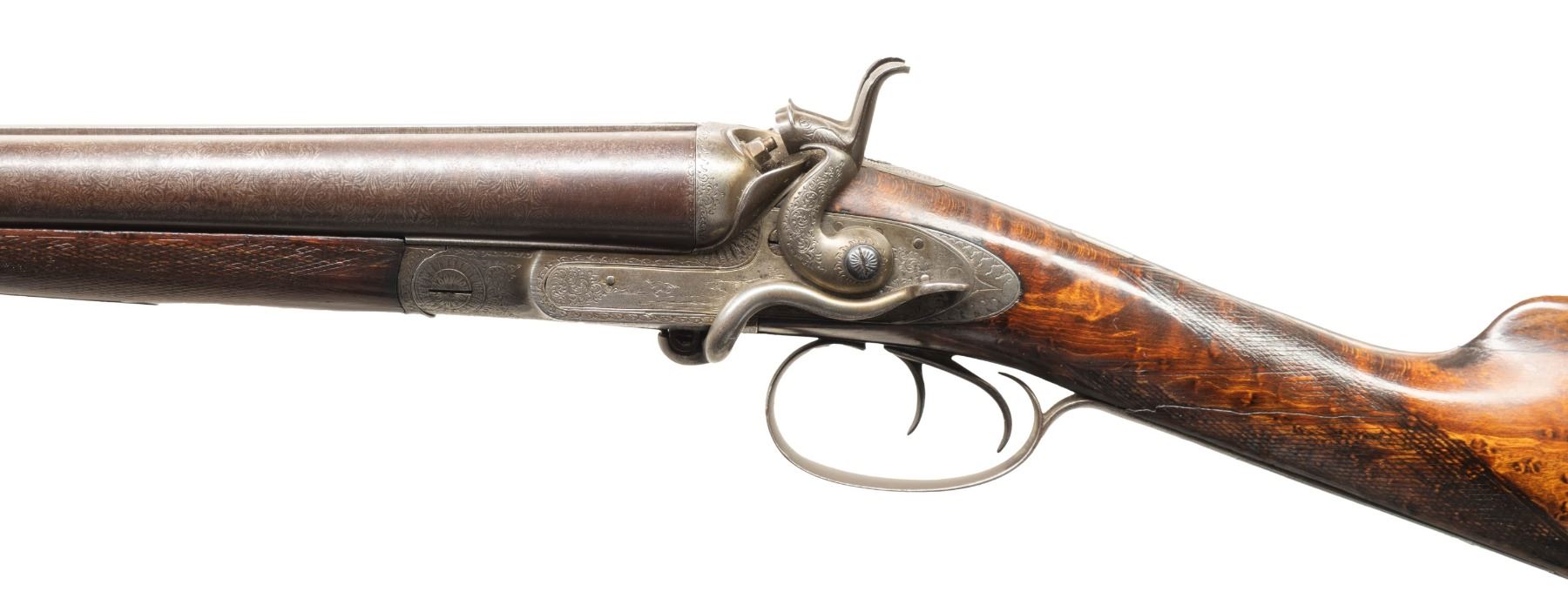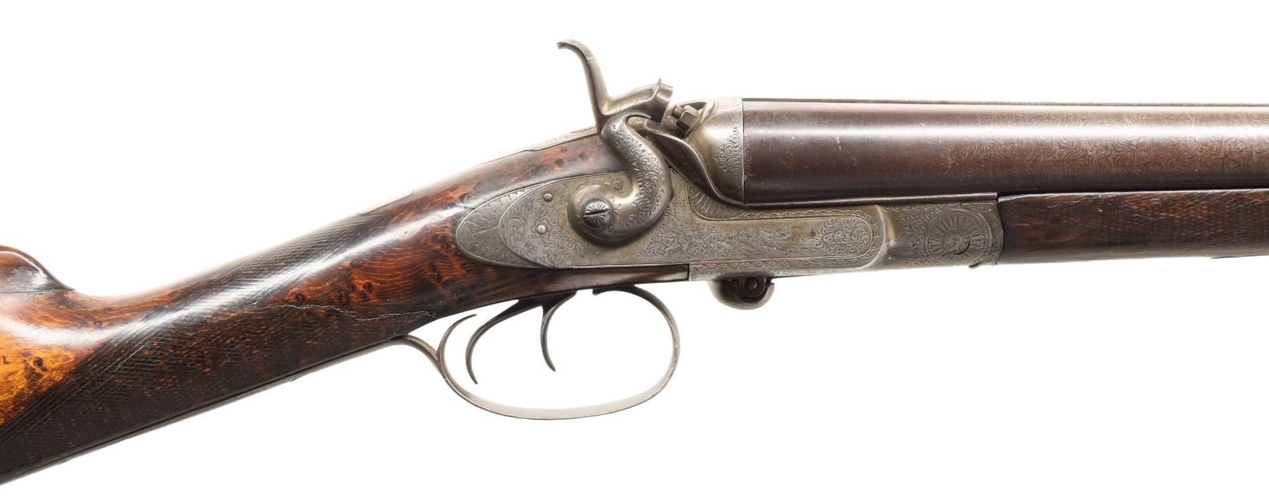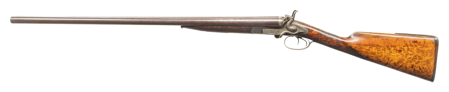 UNDERLEVER SXS HAMMER SHOTGUN. Cal. 12 Ga. S# 2050. This shotgun most likely started as a percussion sxs gun, then converted to take 12 Ga., 2 1/2" shells; chambers appear to be reamed out for 2 3/4" shells but no proofs on water tables. The Damascus 27 1/8" bbls. have bright front bead, 13 Bore London black powder proofs; Chokes appear to measure around Full & Mod. Converted action has sprays of acanthus scroll engraving highlight vignettes of hound & pigeon on locks. Triggerguard bow has vignette of tiger & hound. Bird's eye maple forearm & straight grip buttstock. Forearm has patented Deeley release, checkering & horn tip. Buttstock has checkering at wrist along with wrist plate & 2 spliced piece of walnut that extend to comb & fitted for the tall peak buttplate. LOP: 13.5". CONDITION: barrels have fading brown finish turning gray with scattered light dings & light pitting near chambers. Action has cleaned gray patina appearance. Sanded & refinished wood shows large cracks along with smoothened checkering. Bores show heavy pitting forward of chambers. Barrels show light play to action. Right firing pin has broken spring & will stick impeding opening of action. (01-28481/MD). ANTIQUE. $500-1,000.