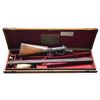 WITH CASE. Cal. .450 3-1/4" bpe. S# 7236 (1866). The 30" two stripe broadly patterned damascus barrels are fitted with full length flat rib. Rib is fitted with three nested folding leaf express rear sight with standing leaf and small silver bead front sights. Rib is engraved "J. Purdey 314 1/2 Oxford Street. London." Barrel flats are stamped with London black powder proofs. Round bodied Jones type "long guard lever" action is fitted with back spring locks with non-rebounding serpentine hammers having stylized dolphin heads. Locks are fitted with front sliding stalking safetys. The long guard lever action is an adaptation of the Jones patent however a long and fairly heavy trigger guard with ring at grip extension snaps into long trigger plate. Entire guard rotates unlocking action. A safety is built into trigger plate so that when guard is not in fully closed position, triggers are blocked and locks cannot be tripped. Straight grip buttstock made of dense fiddle figured European walnut measures 14-1/2" over checkered steel buttplate engraved "CHARGE" "3 1/4 drs No 6 Powder". Stock features long shadow line right hand cheekpiece and well cut grip checkering. Matching splinter forend with steel tip is fully checkered and attaches to barrels with captive sidebolt through shaped and engraved steel escutcheons. UNATTACHED ACCESSORIES: rifle comes with its original (S# on paper dot under label), quartered oak case with circular "D" ring handle in top. Interior is lined in scarlet cloth and Purdey label in lid is inscribed with charge and loading information. Case contains a hollow pointing pin marked with this guns S#, a tin of grease, Hawksley marked pewter top oil bottle and an ebony cleaning plug marked "450". An old hang tag from W. Keith Neal is addressed to a Mr. A. G. Crowley. CONDITION: fine with some alterations. Barrels retaining about 80% original damascus pattern with some thinning at wear points and some scratches. Action retains about 20% original case hardening color. Lockplates retain about 80% of their color. Stocks retain most of their rubbed oil finish, are quite dry and have a good number of marks. Enfield rifled bores are very fine; bright, sharp and shiny throughout. Action is tight; barrels somewhat off face. It appears rifle has been recently tightened with evidence of filing and polishing on barrel lumps and heat discoloration of metal on breech face. Locks are crisp. Safety is operable. Lock tail retaining screws in buttstock are missing, so lock tails protrude from inletting. (Should be corrected before firing.) Case shows considerable wear to old re-varnish with 14" crack on left side of top. Interior cloth is fair, considerably soiled. Label is poor, dark, badly foxed with holes and chips. Partitions are weak with some repairs, need more. Accessories are good. (01-26557/MGM). ANTIQUE. $6,000-9,000.